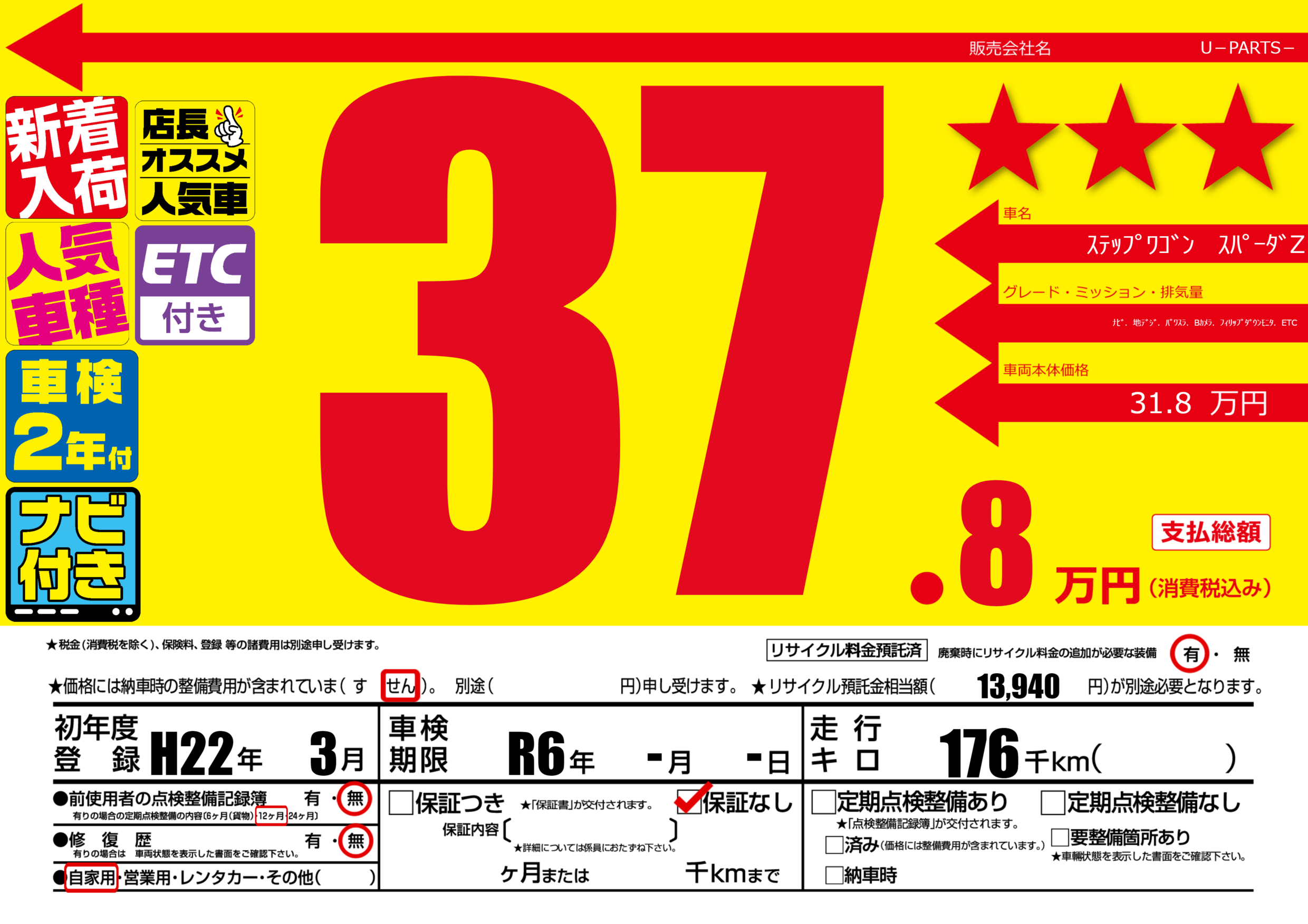 | 走行キロ | 17.6万km | 初年度登録 | H22年3月 |