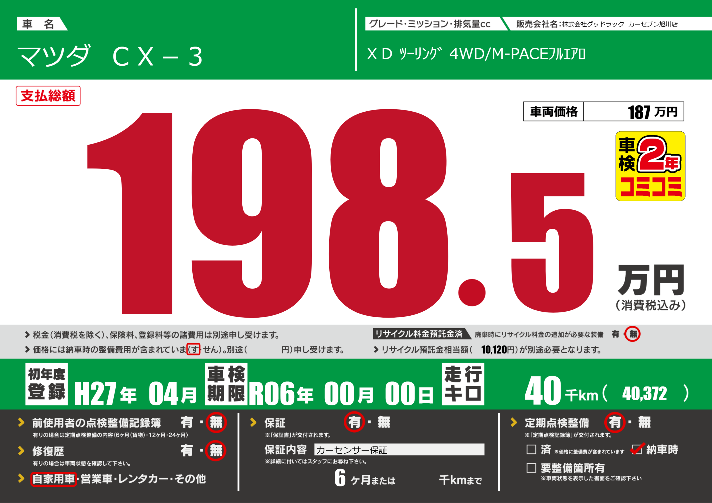 | 車名 | マツダ CX-3 | グレード ミッション 排気量 |