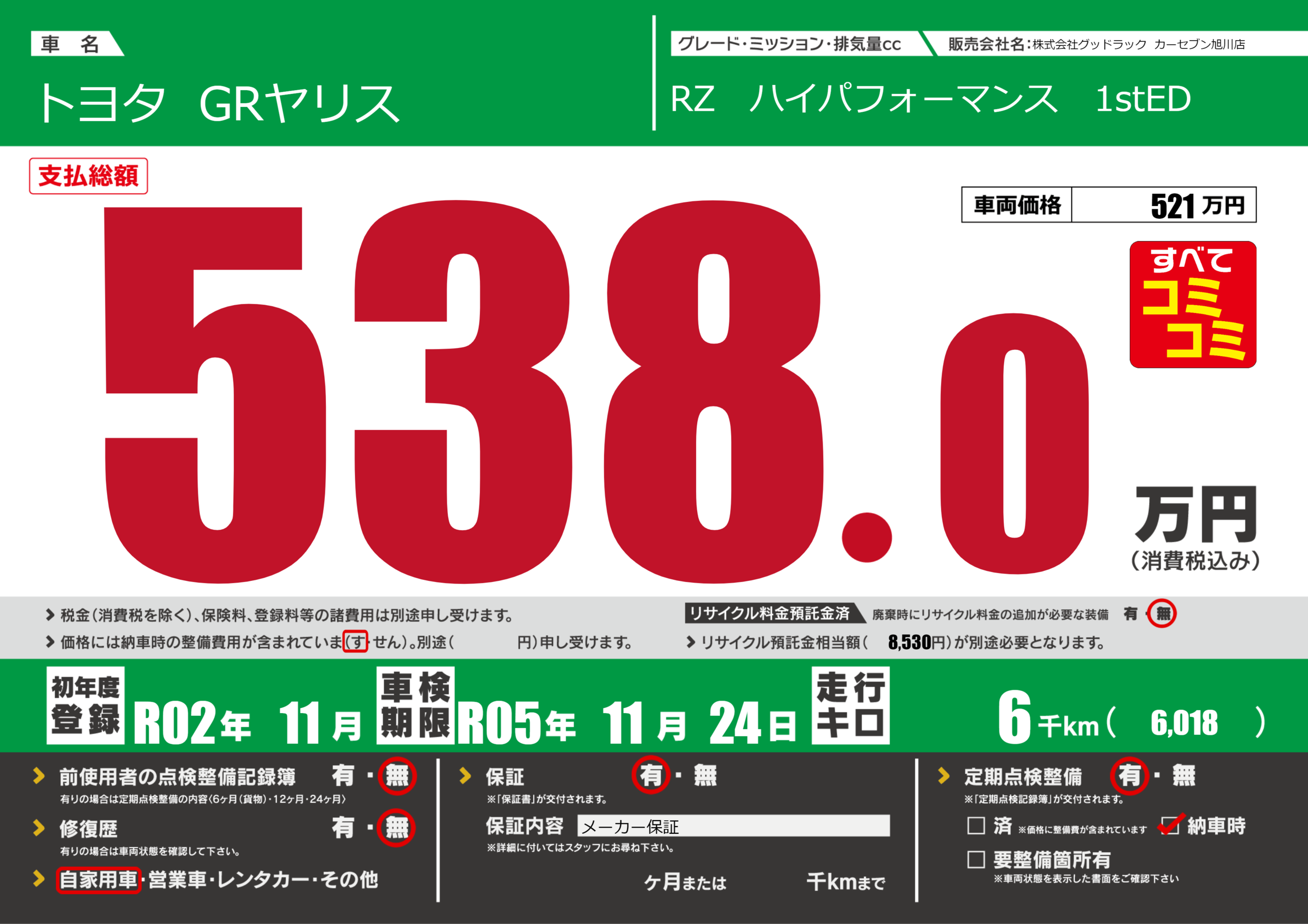 | 車名 | トヨタ GRヤリス | グレード ミッション 排気量 |