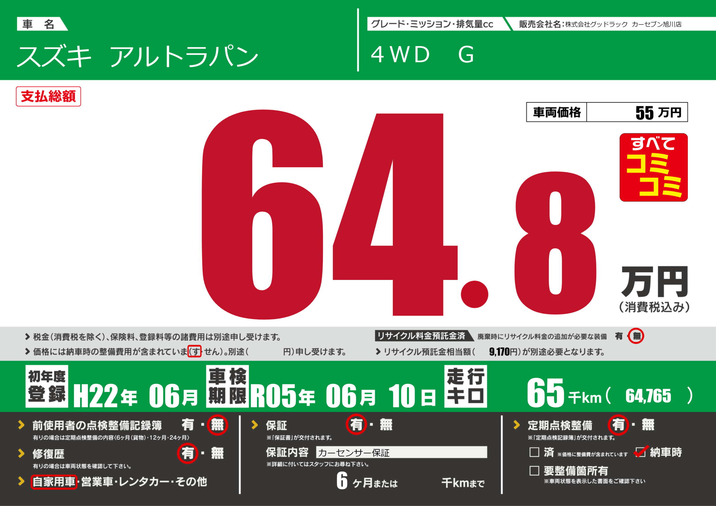 | 走行キロ | 6.5万km | 初年度登録 | H22年06月 |