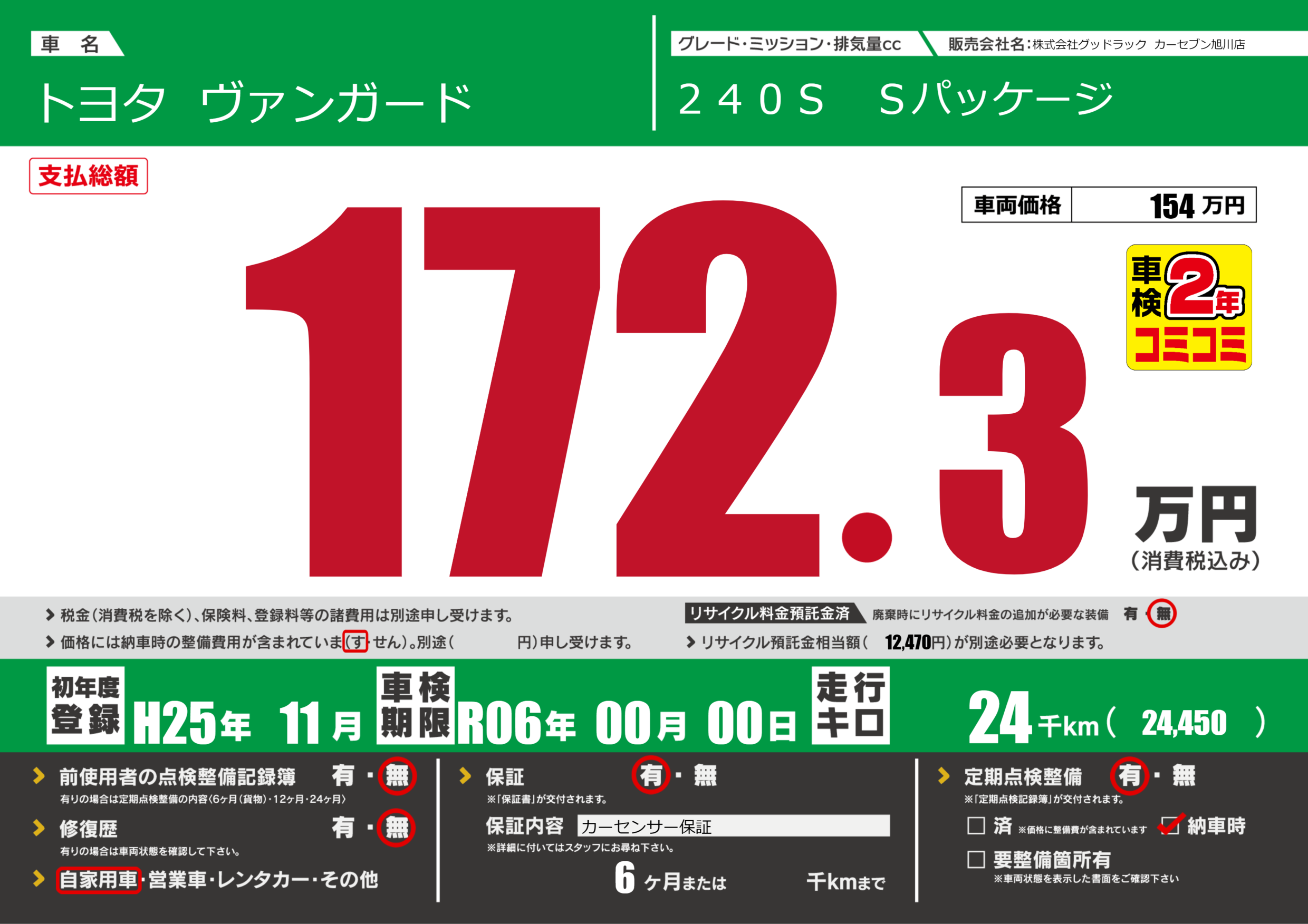 | 車名 | トヨタ ヴァンガード | グレード ミッション 排気量 |