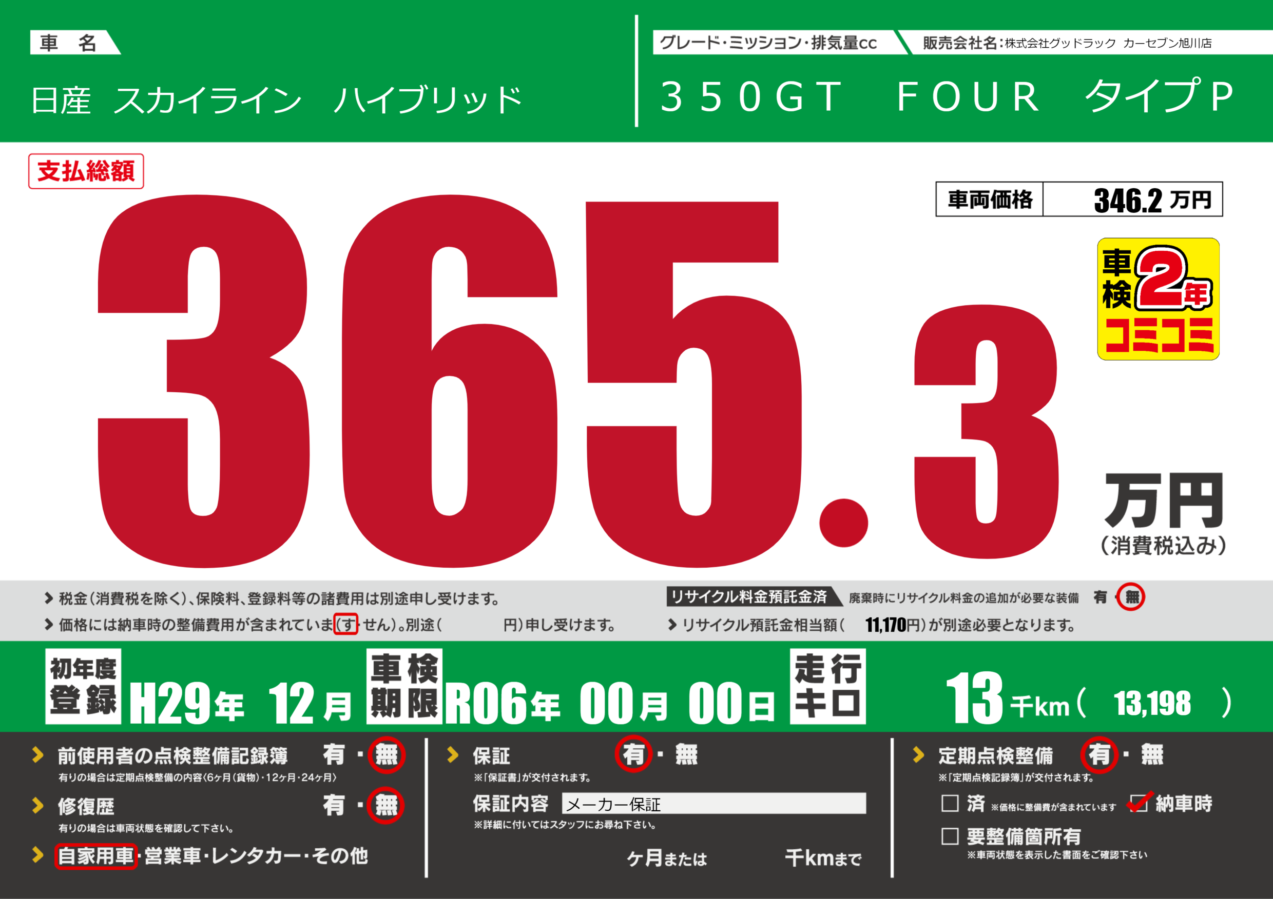 | 車名 | 日産 スカイライン ハイブリッド | グレード ミッション 排気量 |