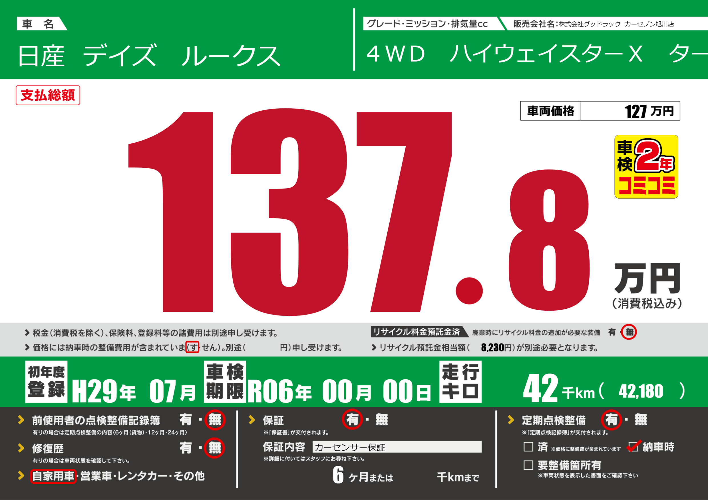 | 走行キロ | 4.2万km | 初年度登録 | H29年07月 |
