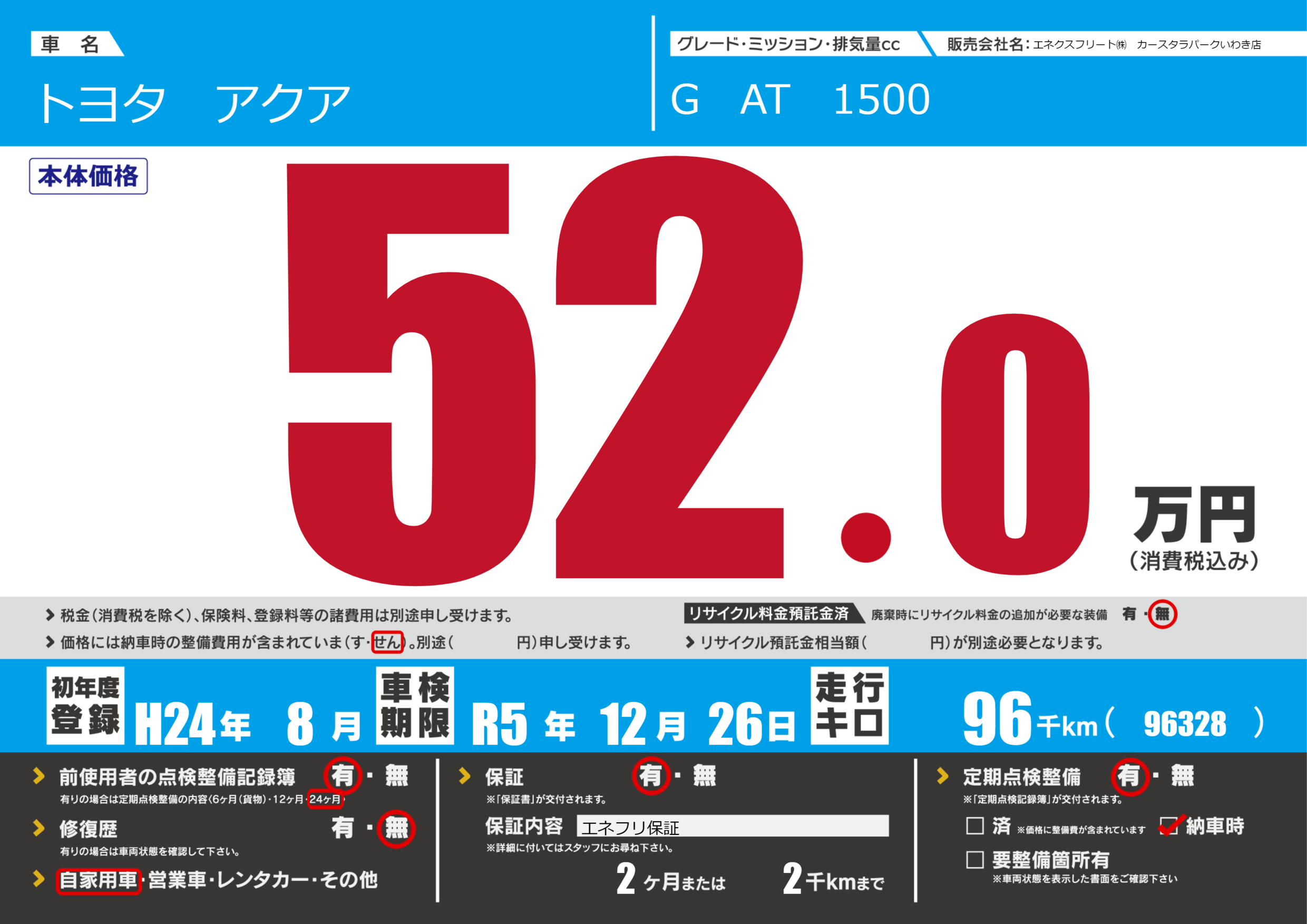 保証付き 保証内容(エネフリ保証) 2ヶ月または(2)千kmまで |