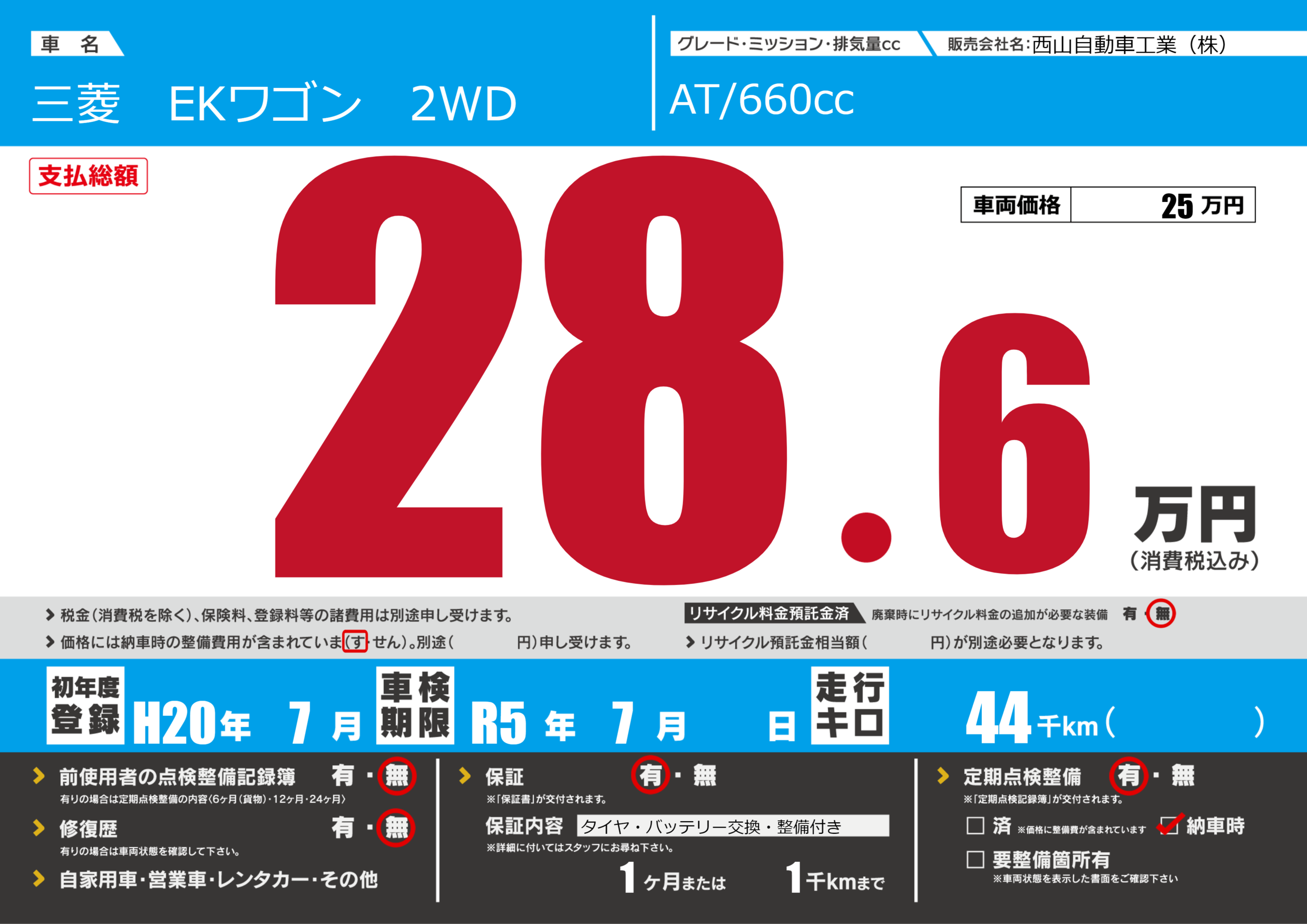 | 車名 | 三菱 EKワゴン 2WD | グレード ミッション 排気量 |