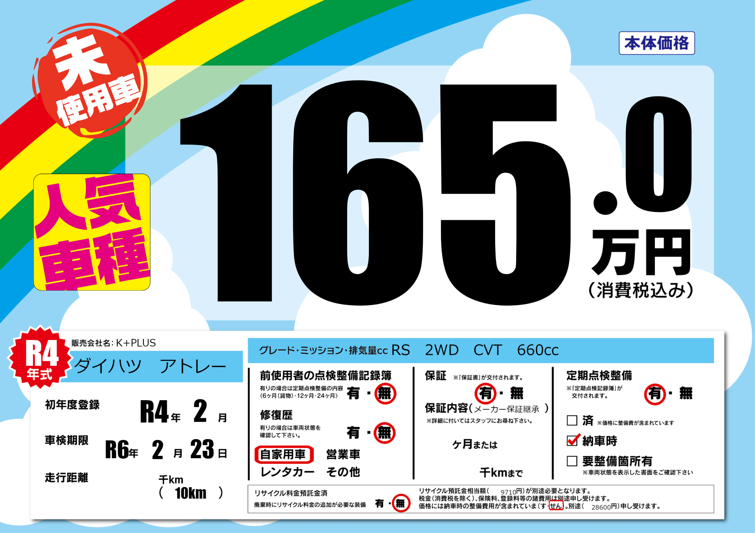 | 定期点検整備 | 定期点検整備あり 納車時あり | ||