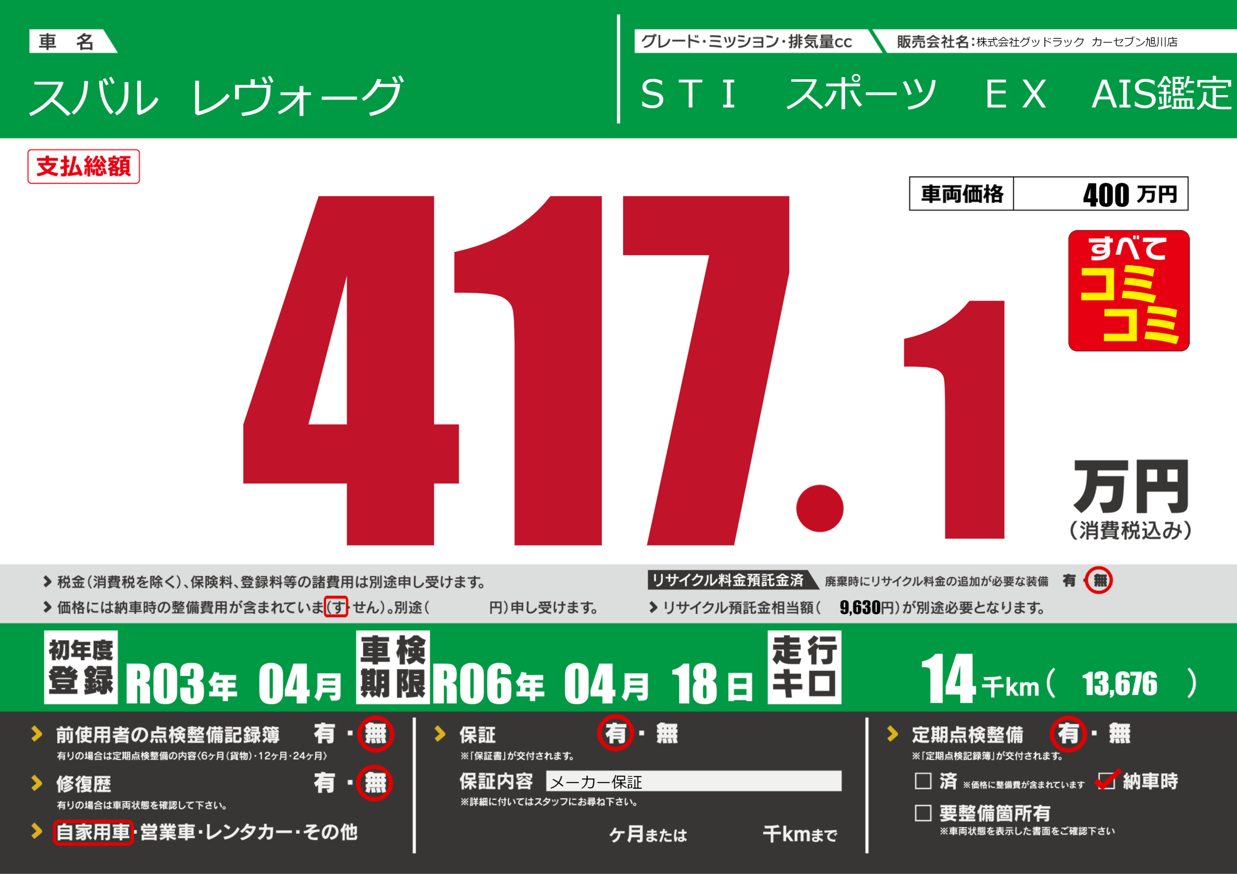 | 車名 | スバル レヴォーグ | グレード ミッション 排気量 |