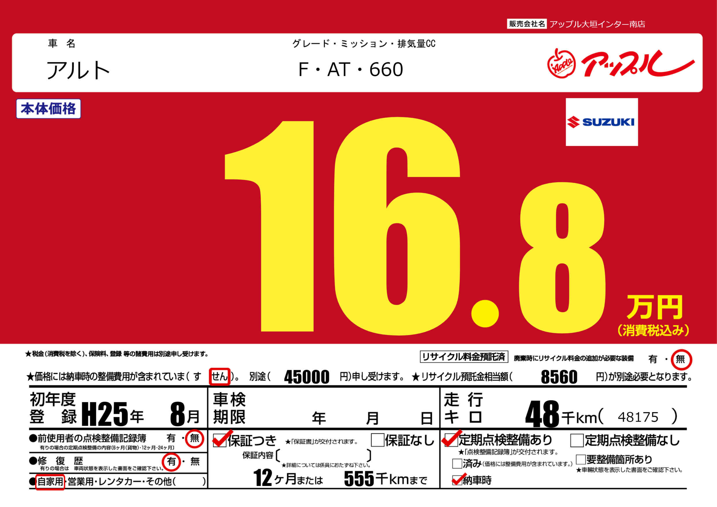 | 定期点検整備 | 定期点検整備あり 納車時あり | ||