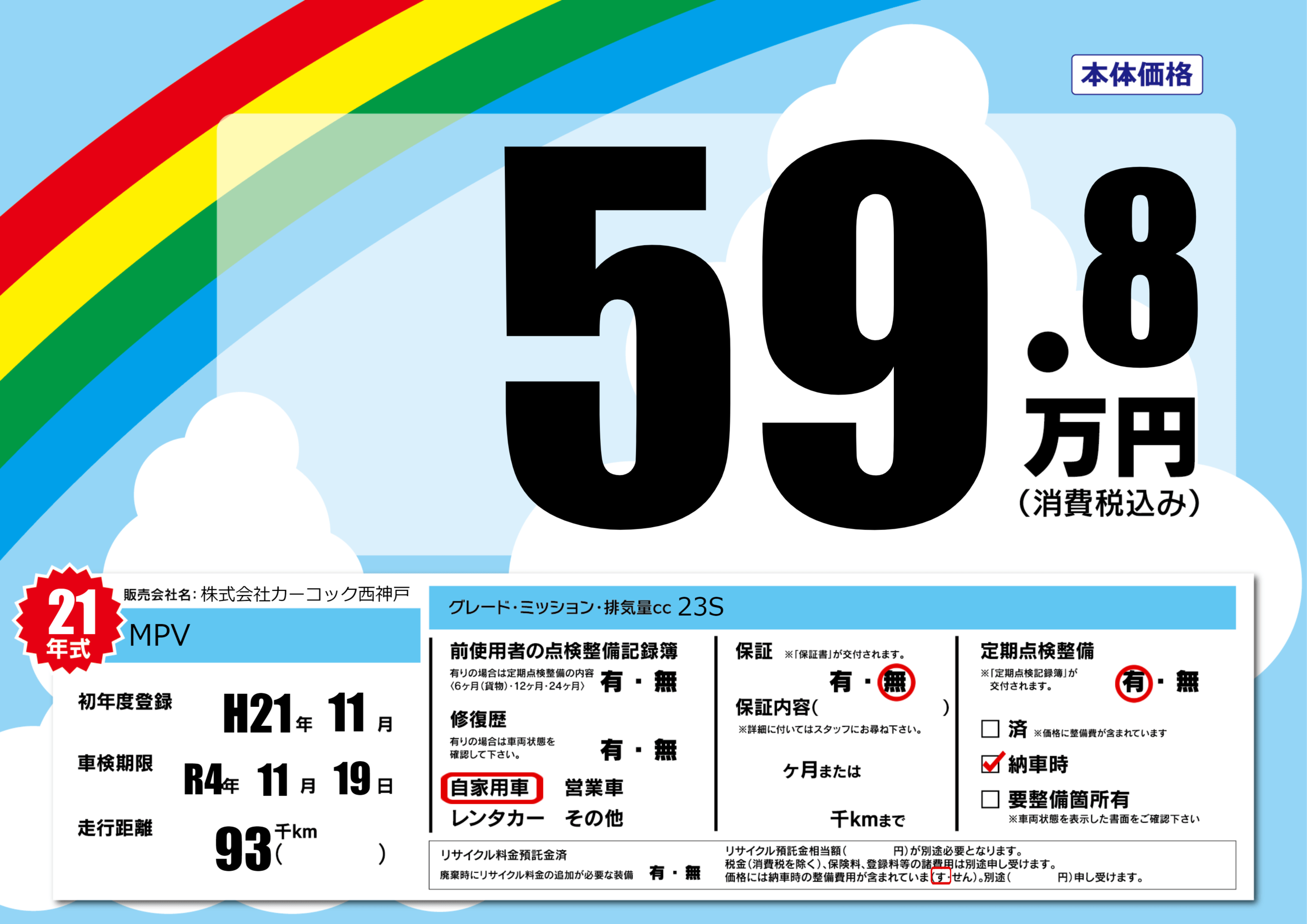 | 走行キロ | 9.3万km | 初年度登録 | H21年11月 |