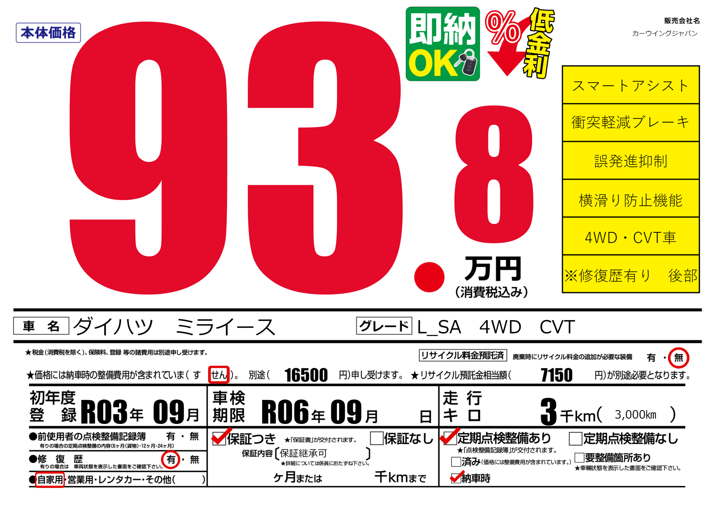 | 車検制限 | R06年 09月 - 日 | ||