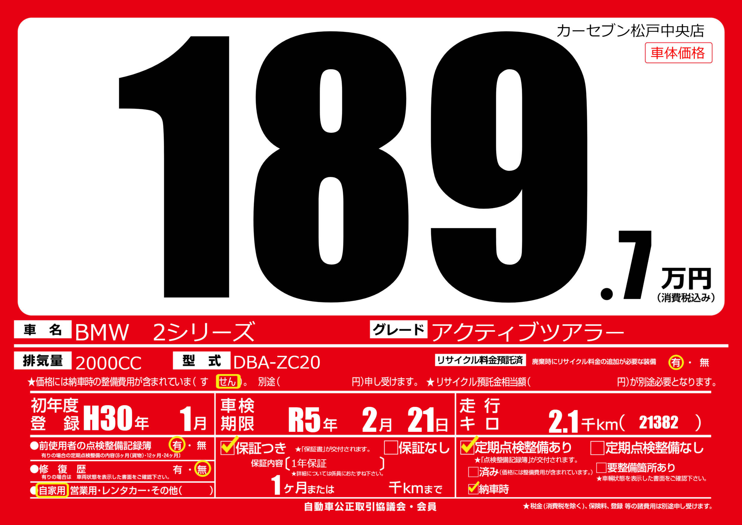 | 車名 | BMW 2シリーズ | グレード ミッション 排気量 |