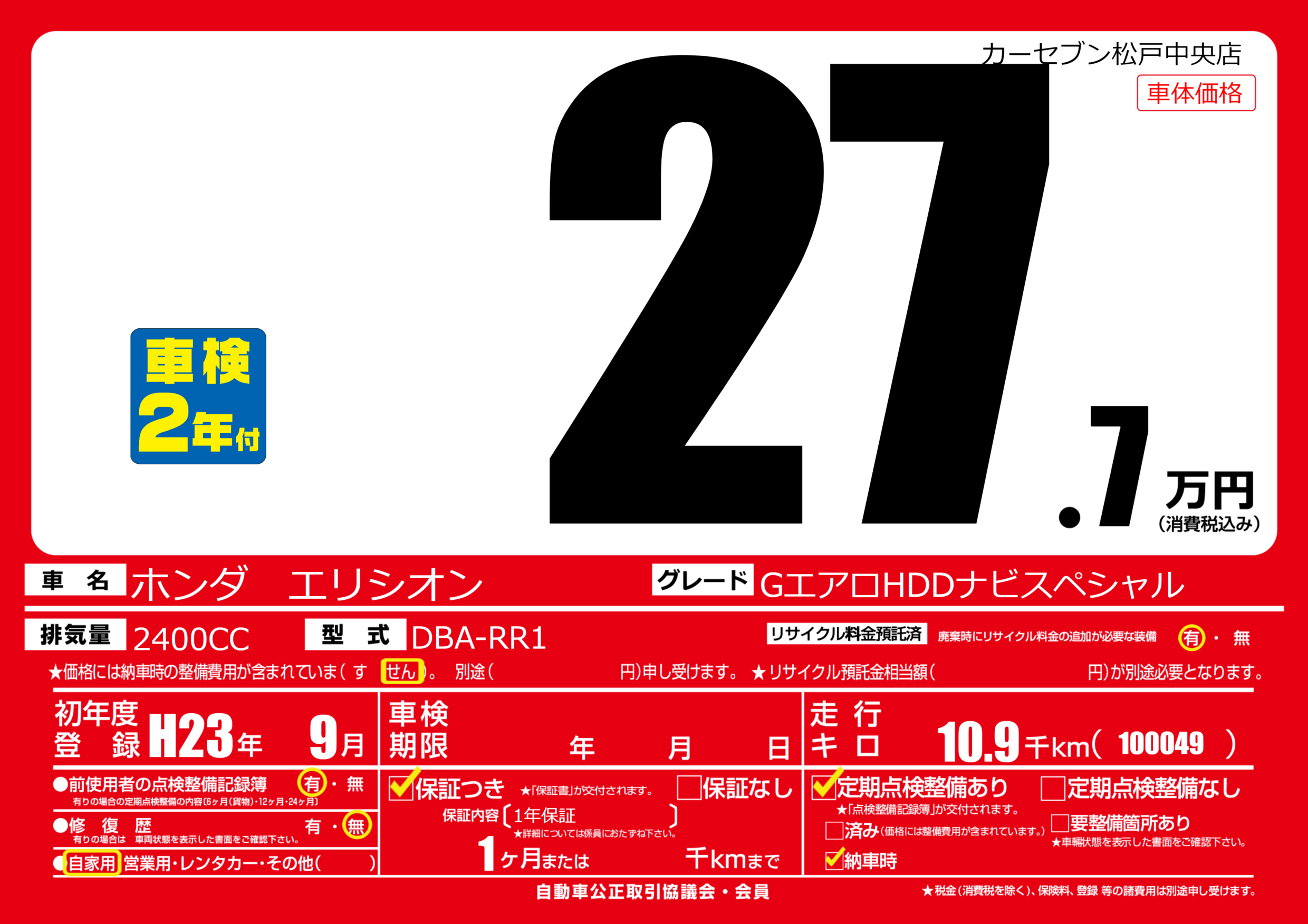 | 走行キロ | 1万km | 初年度登録 | H23年9月 |
