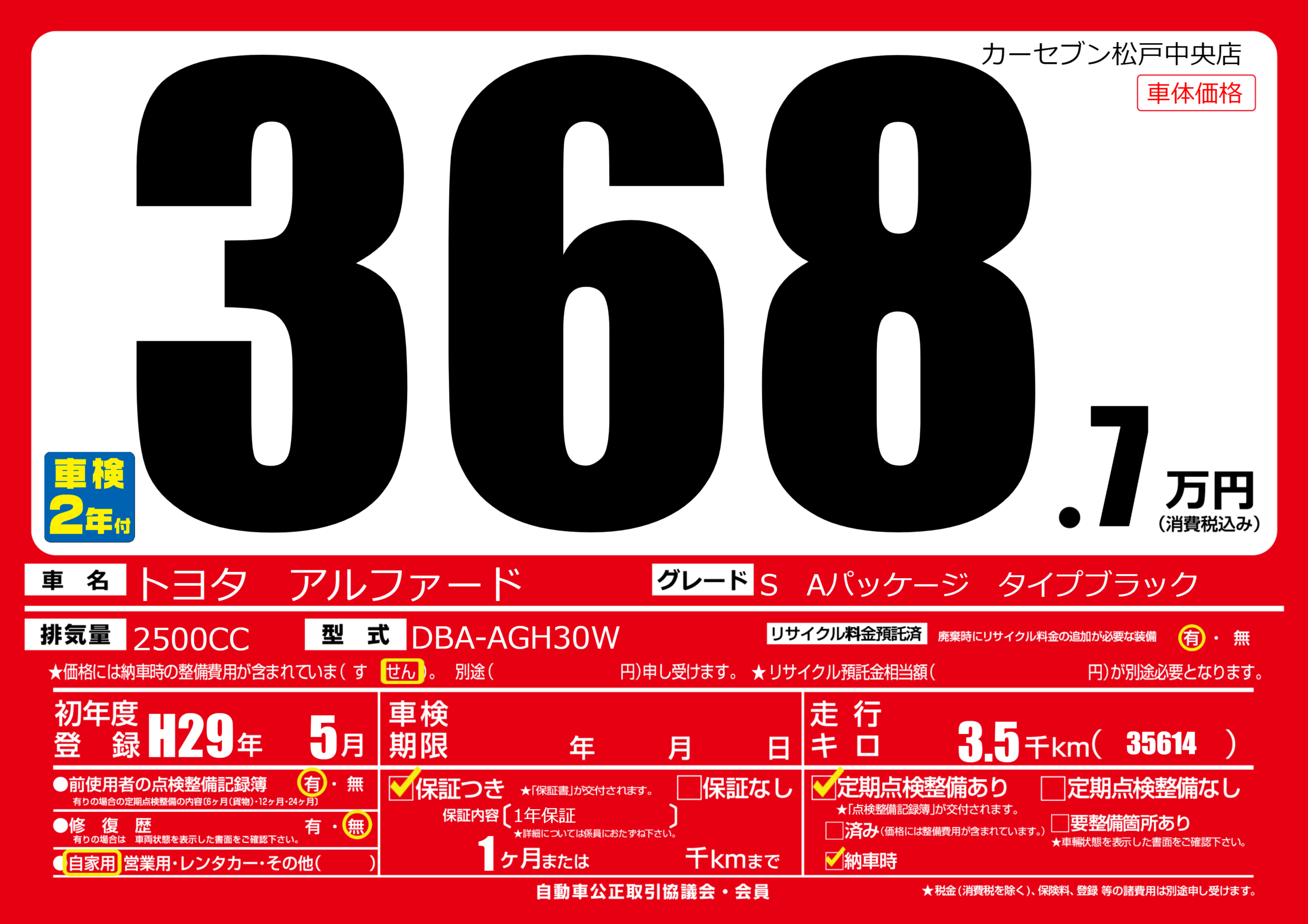 | 車名 | トヨタ アルファード | グレード ミッション 排気量 |