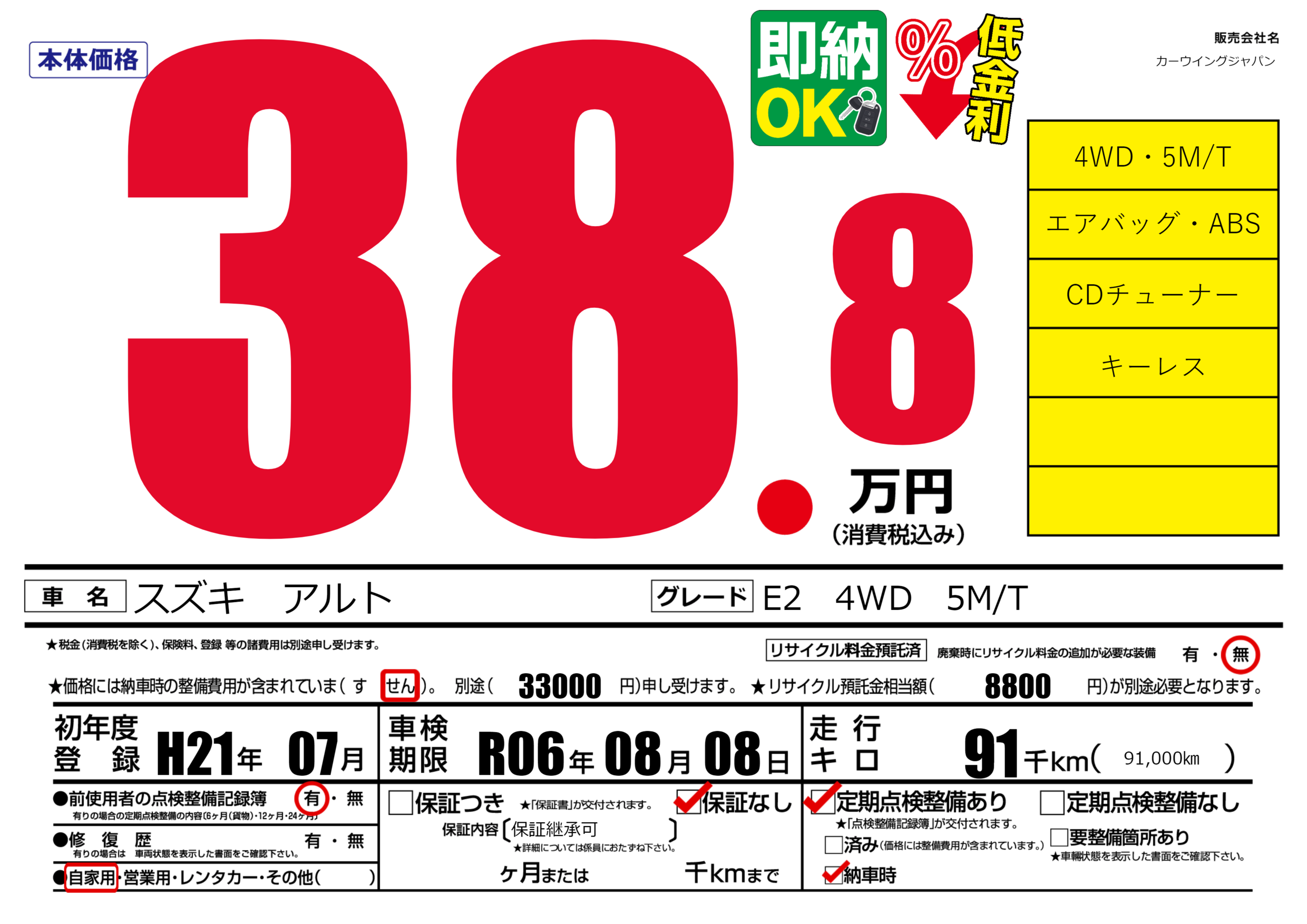 保証なし 保証内容(保証継承可) ---ヶ月または()千kmまで |