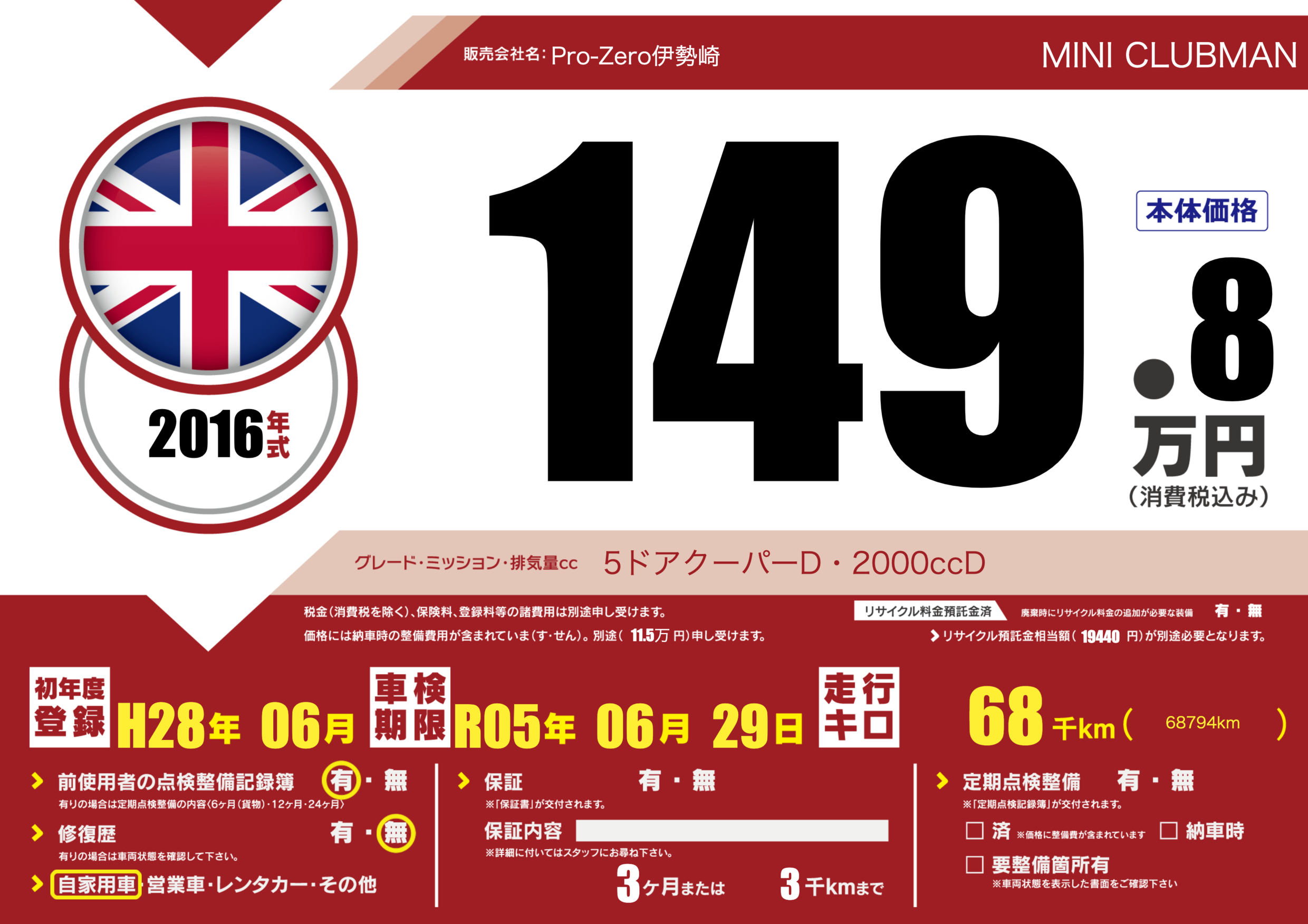 | 車名 | MINI CLUBMAN | グレード ミッション 排気量 |