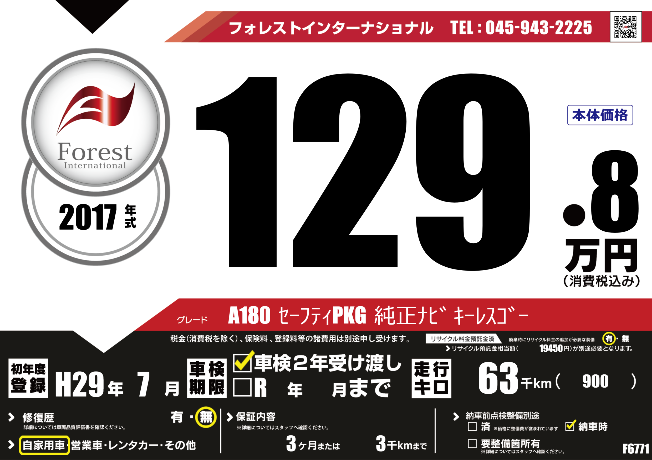 | 走行キロ | 6.3万km | 初年度登録 | H29年7月 |