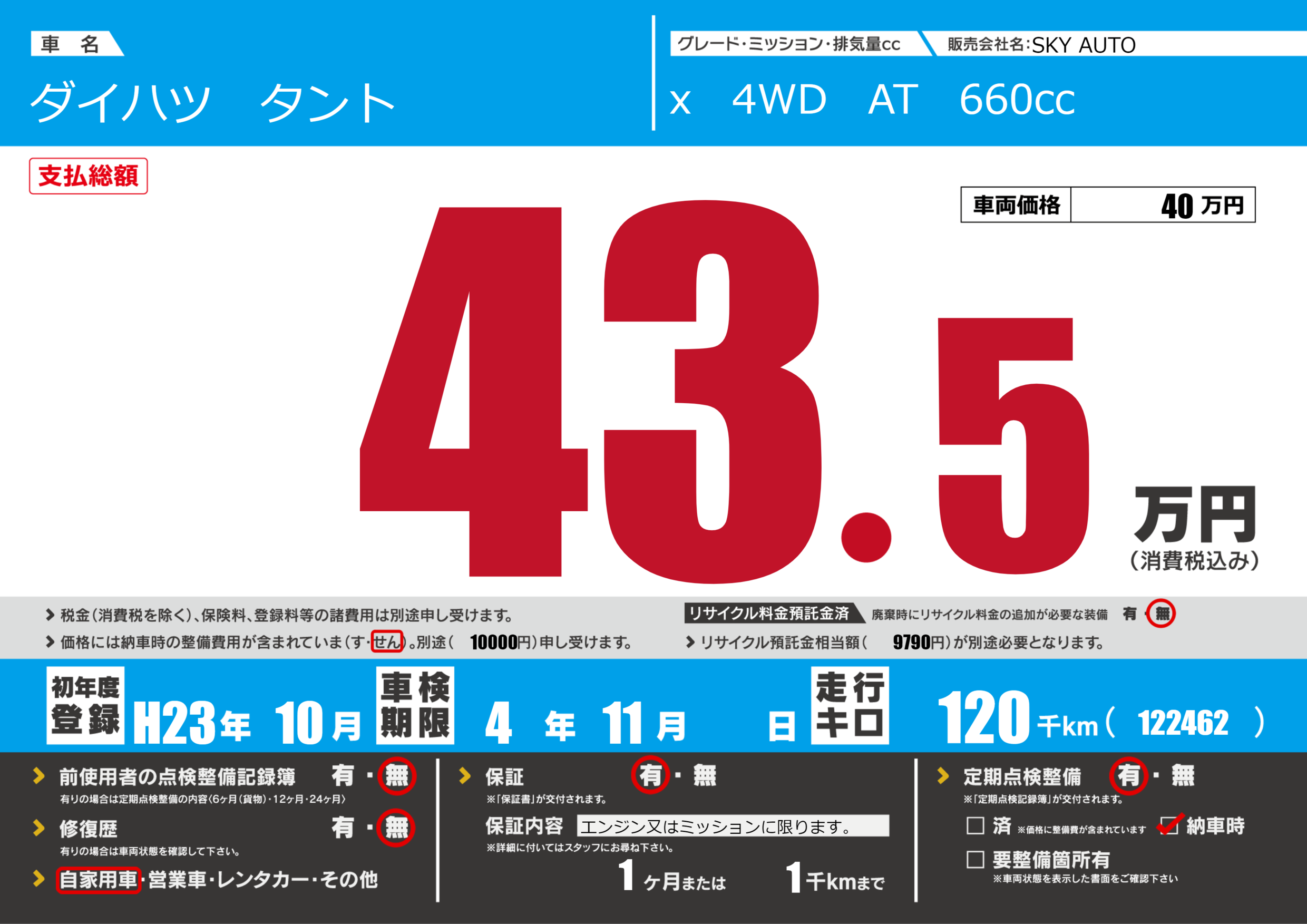 | 車名 | ダイハツ タント | グレード ミッション 排気量 |
