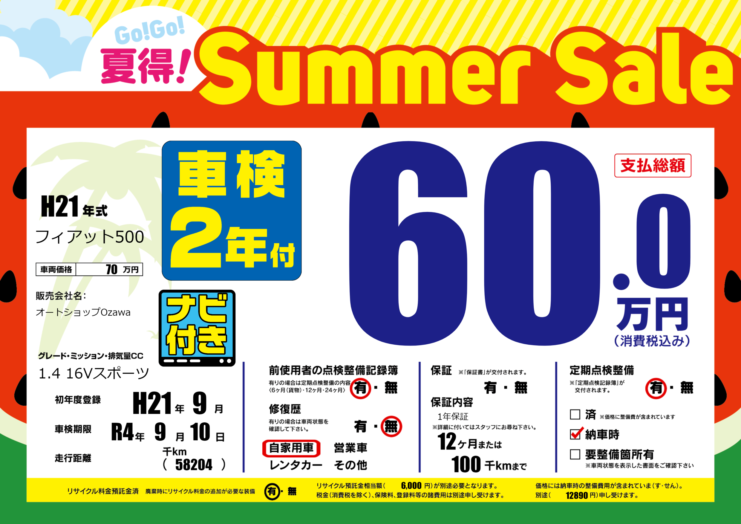 | 車名 | フィアット500 | グレード ミッション 排気量 |