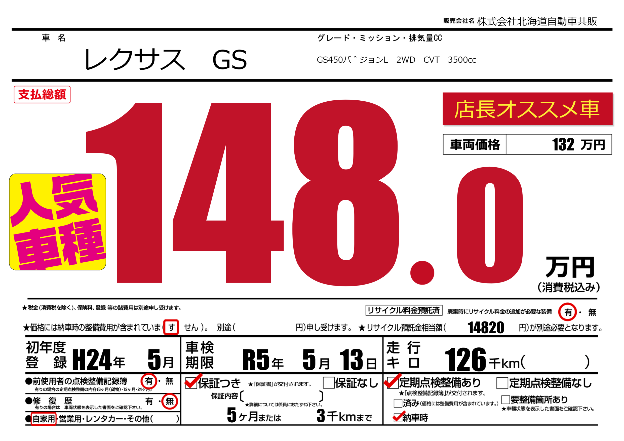 | 車名 | レクサス GS | グレード ミッション 排気量 |