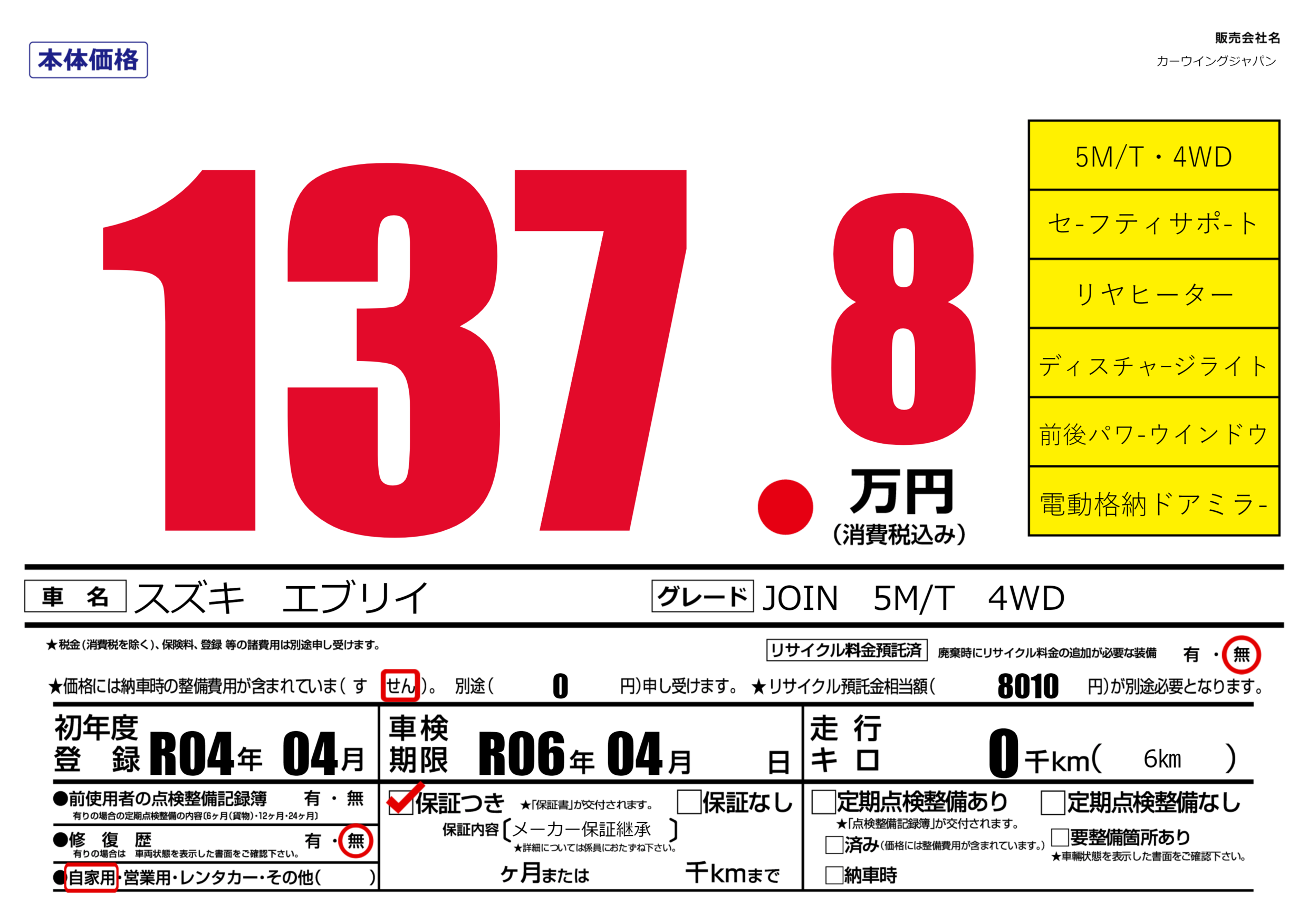 | 車名 | スズキ エブリイ | グレード ミッション 排気量 |