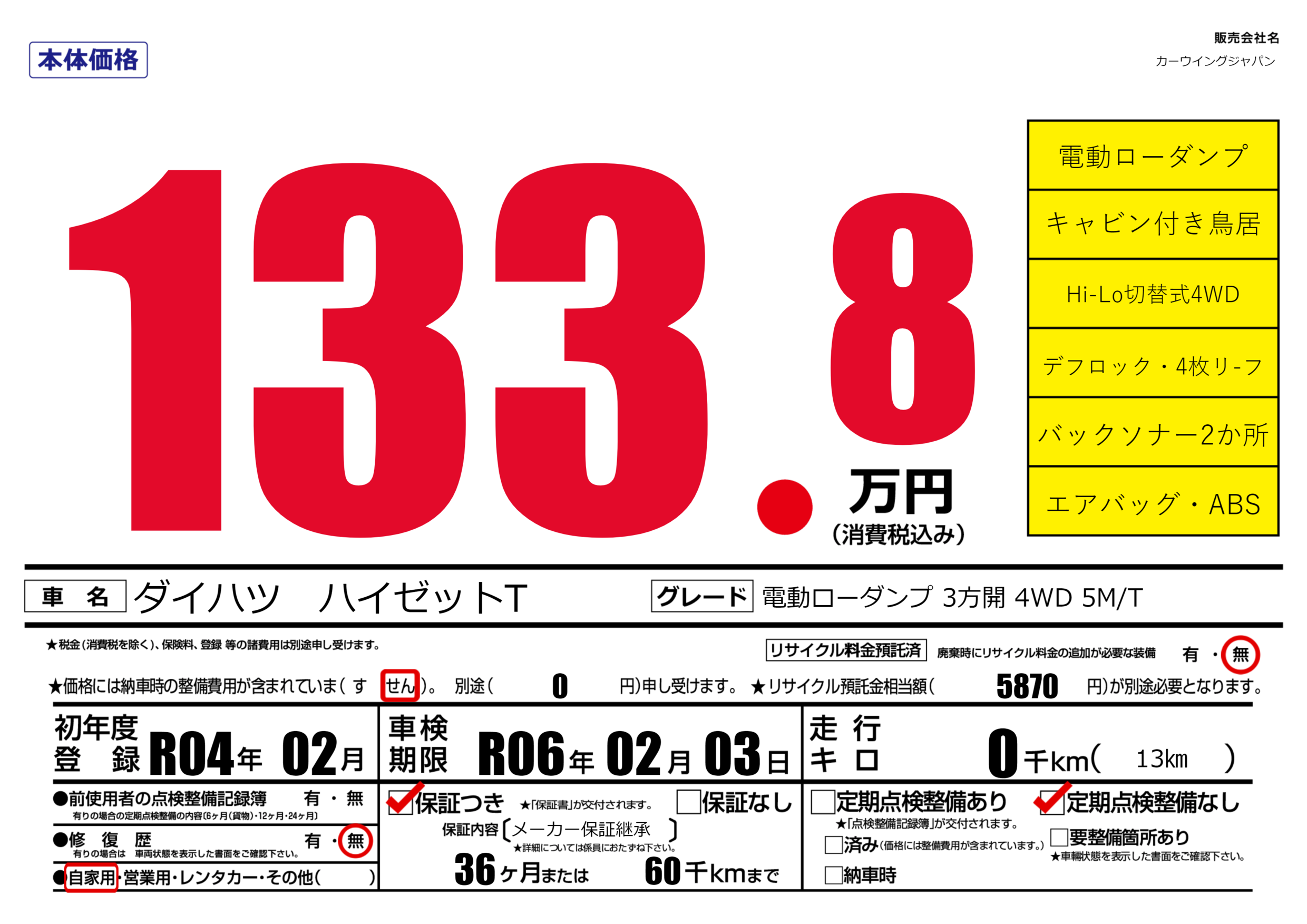 | 車名 | ダイハツ ハイゼットT | グレード ミッション 排気量 |