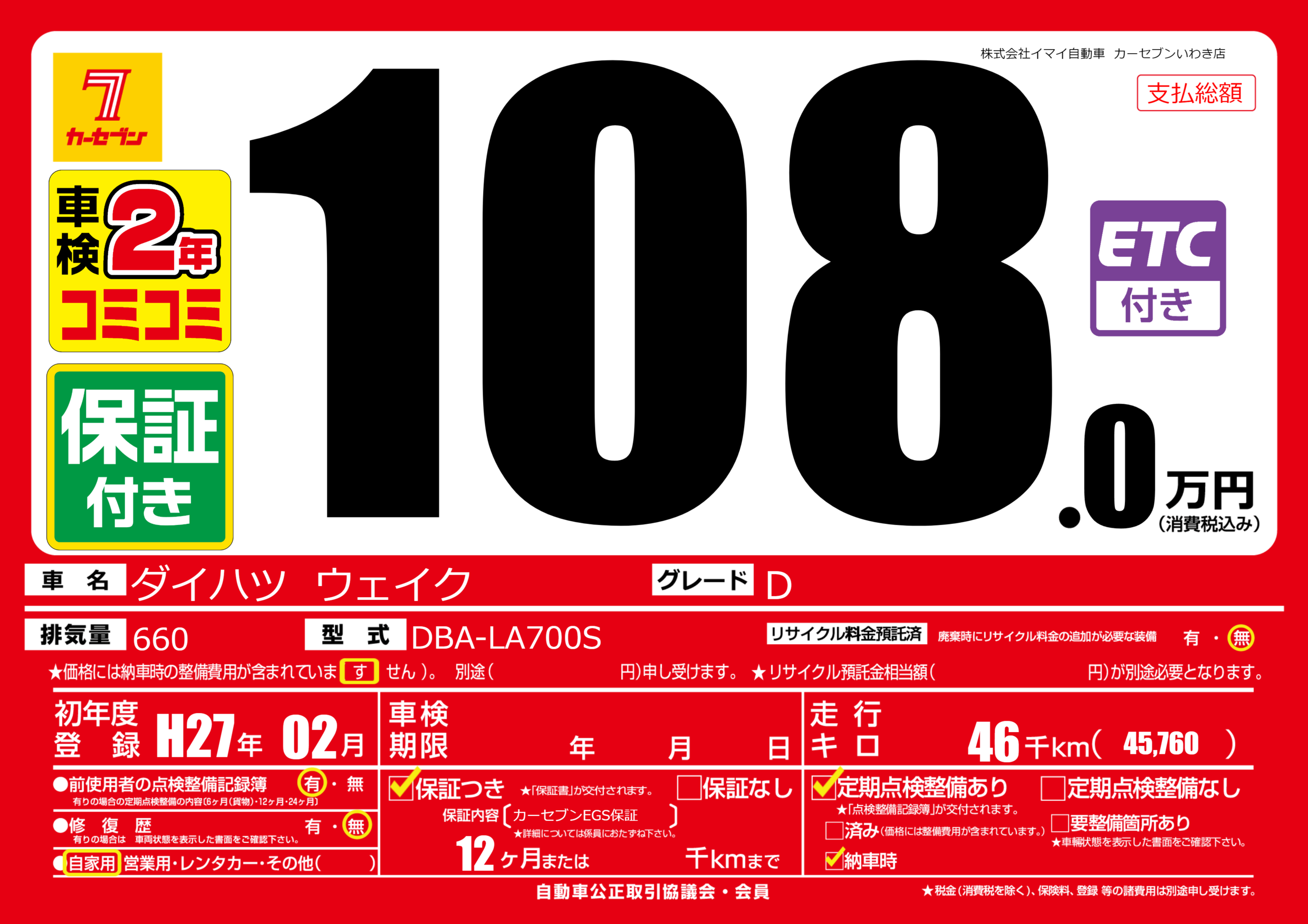 | 車名 | ダイハツ ウェイク | グレード ミッション 排気量 |