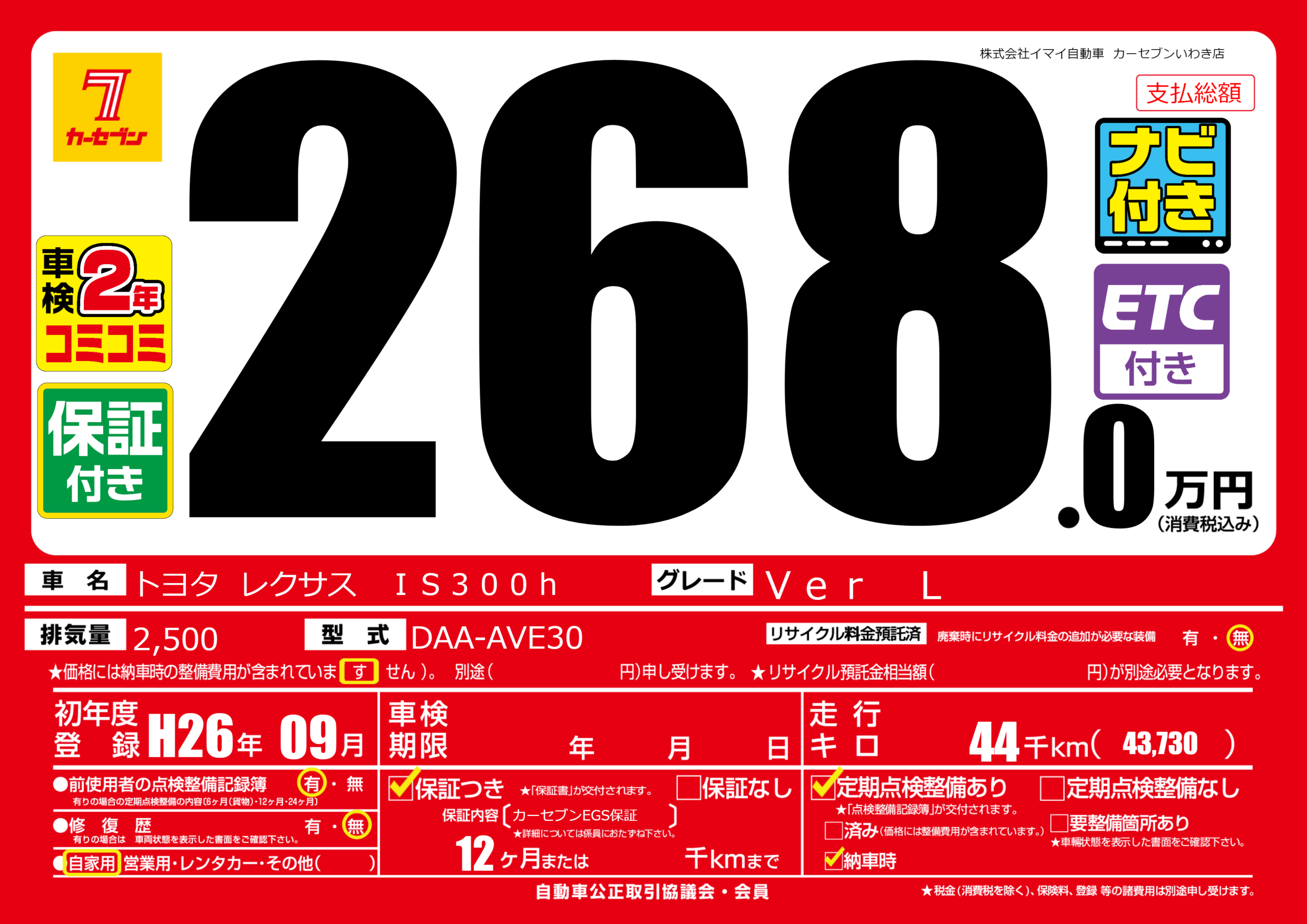 | 車名 | トヨタ レクサス IS300h | グレード ミッション 排気量 |