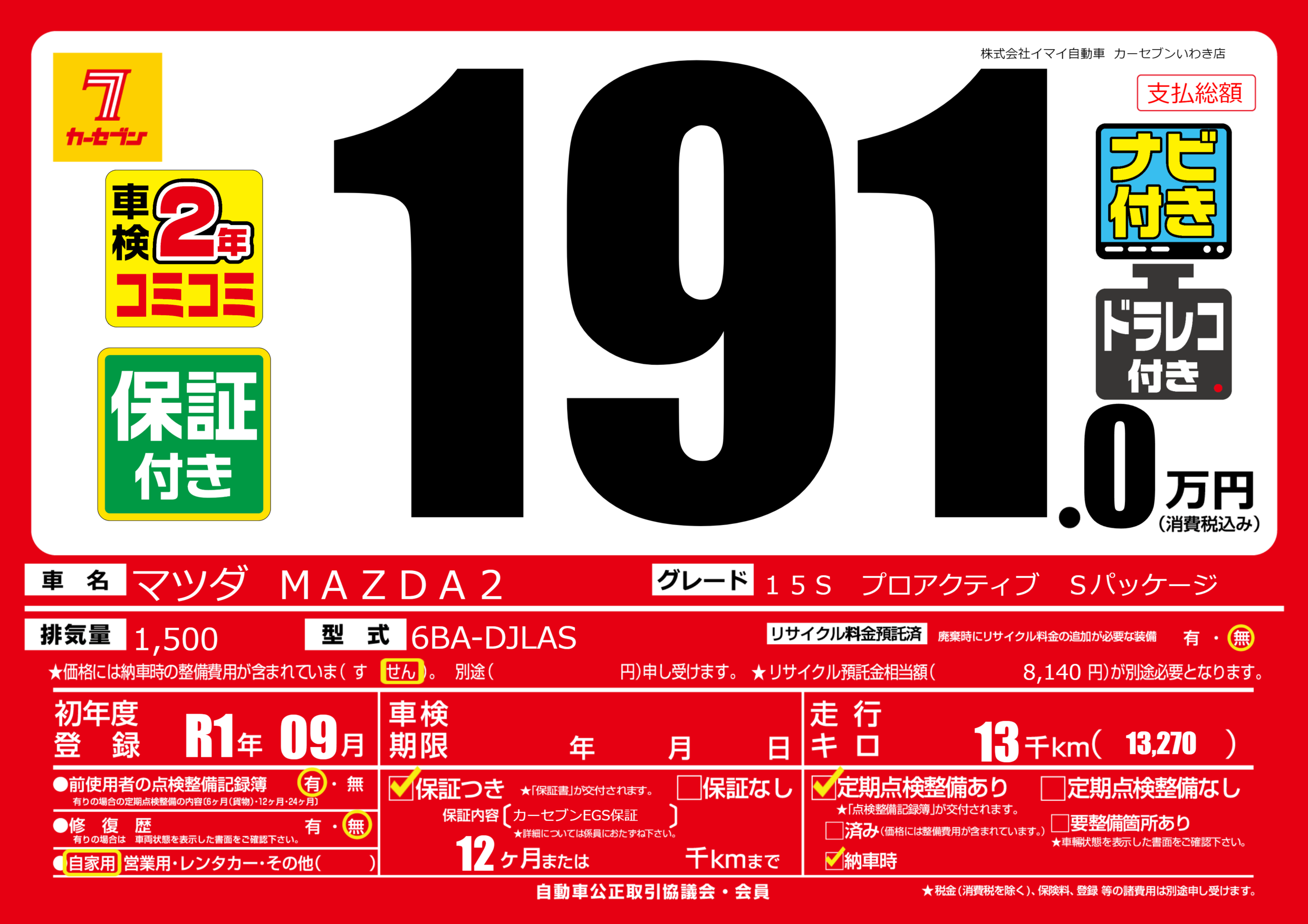 | 車名 | マツダ MAZDA2 | グレード ミッション 排気量 |