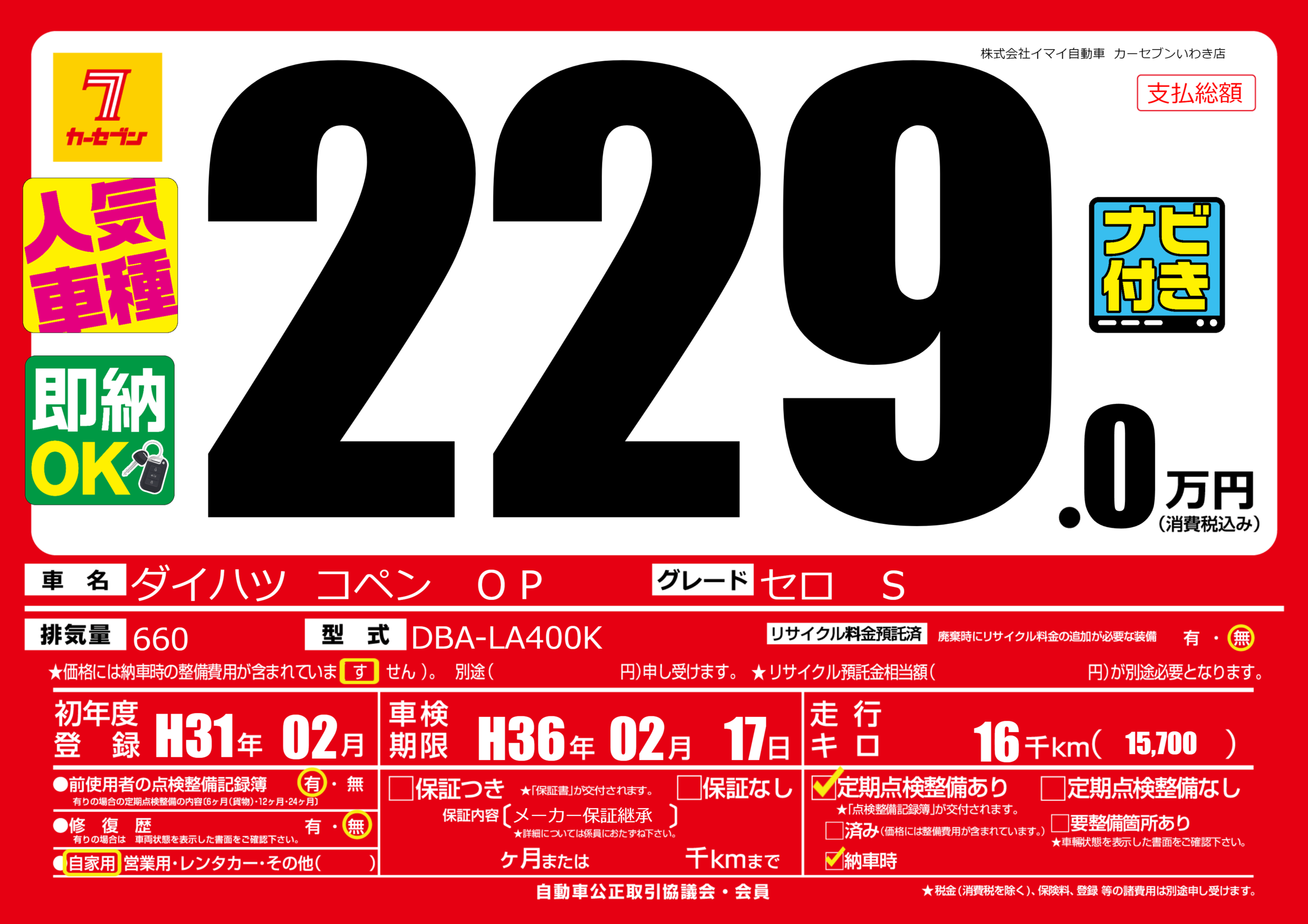 | 車名 | ダイハツ コペン OP | グレード ミッション 排気量 |
