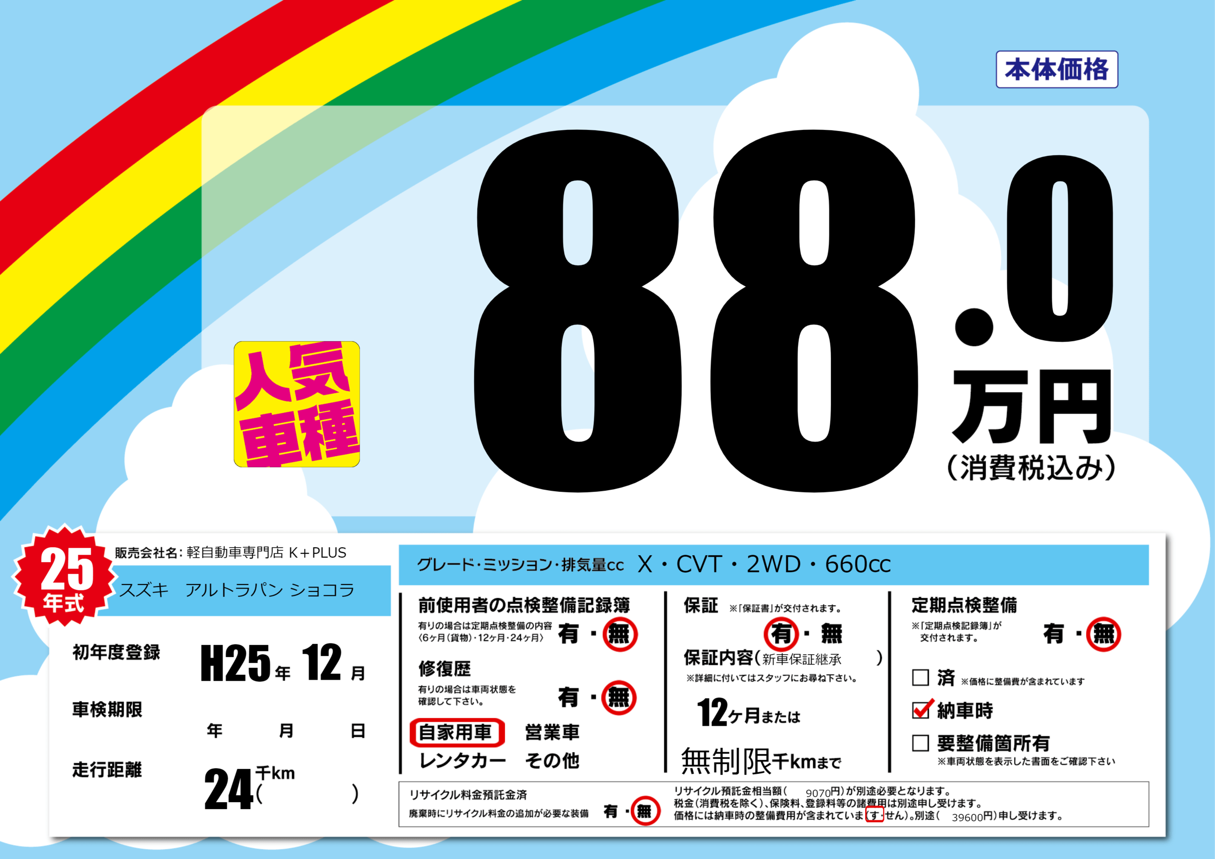 | 走行キロ | 2.4万km | 初年度登録 | H25年12月 |