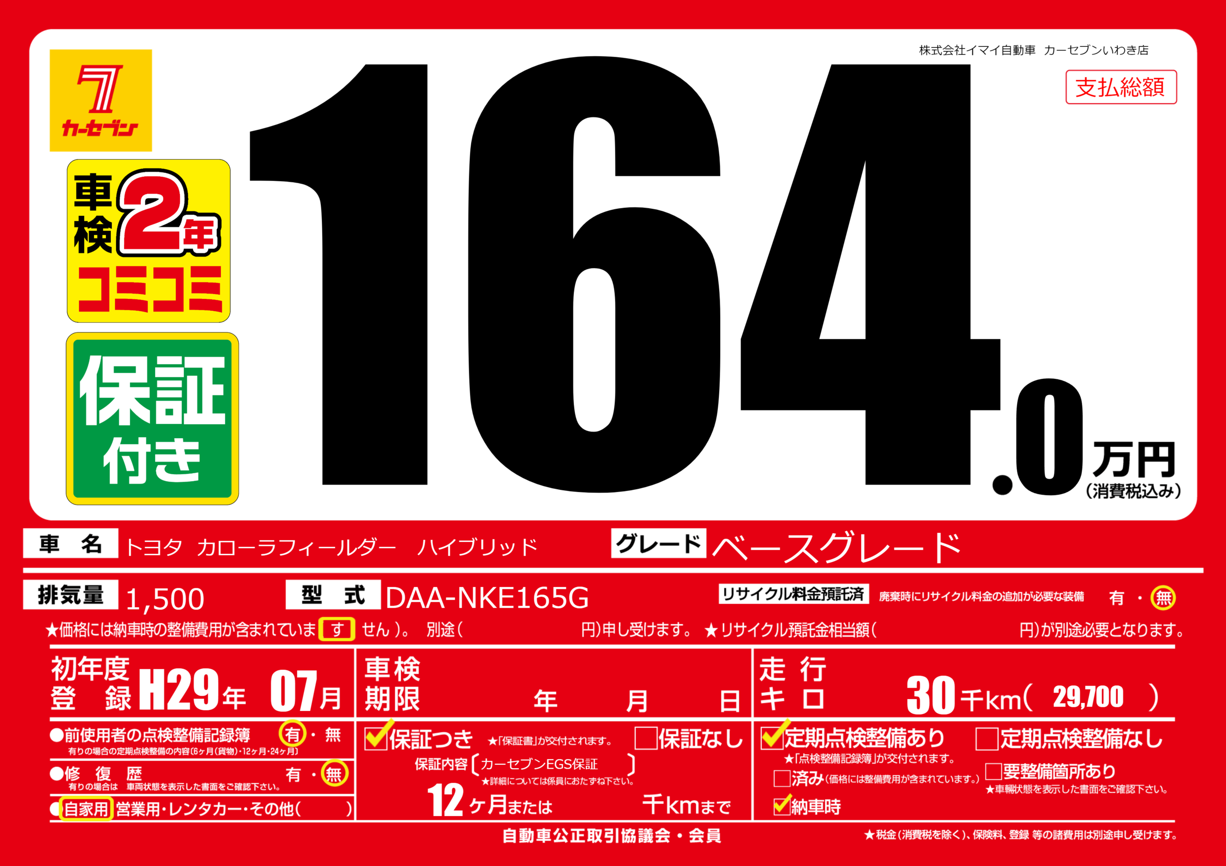 保証付き 保証内容(カーセブンEGS保証) 12ヶ月または千km |
