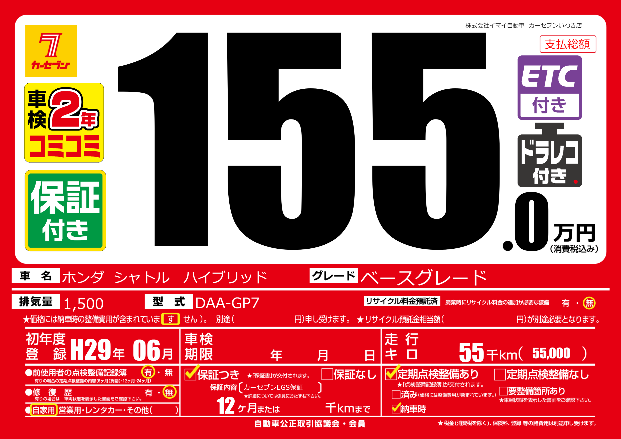 保証付き 保証内容(カーセブンEGS保証) 12ヶ月または千km |