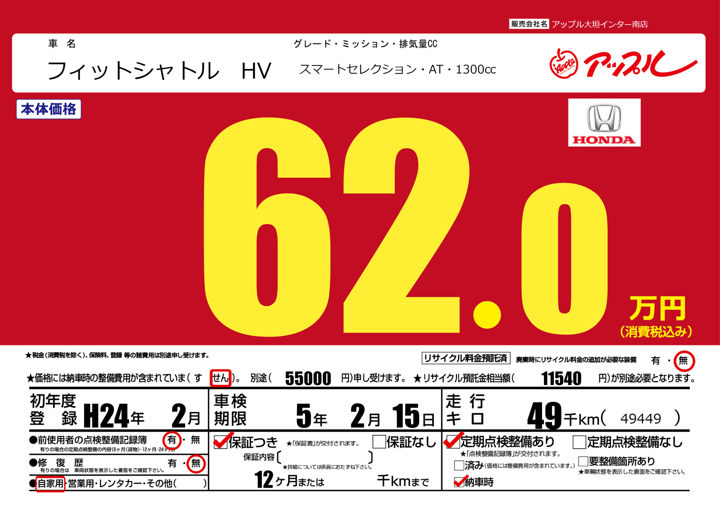 | 車名 | フィットシャトル HV | グレード ミッション 排気量 |