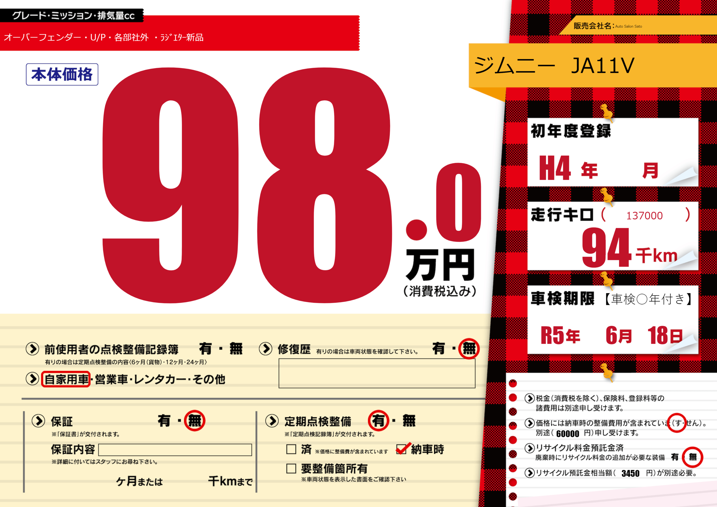 | 走行キロ | 9.4万km | 初年度登録 | H4年---月 |