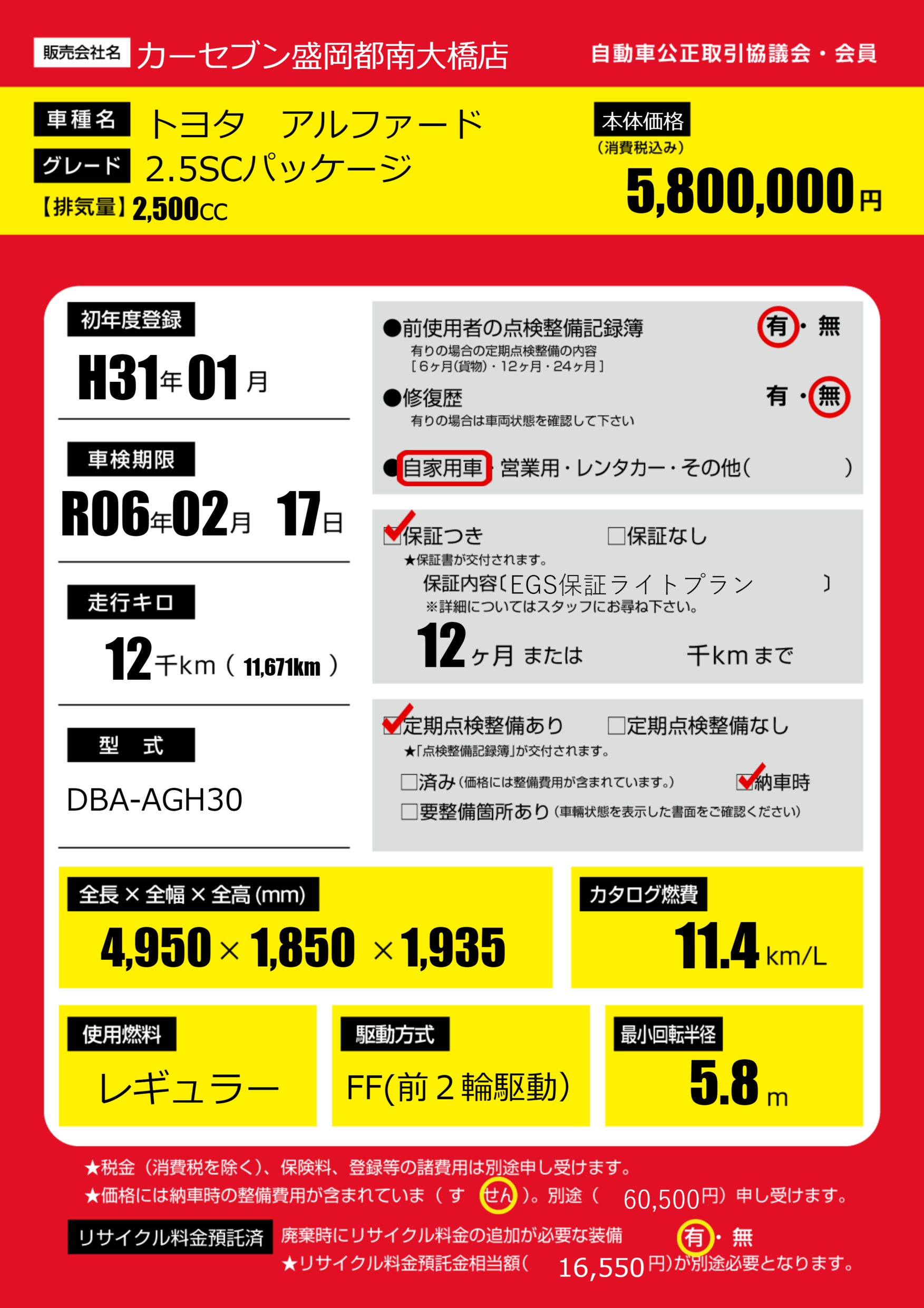 | 車名 | トヨタ アルファード | グレード ミッション 排気量 |