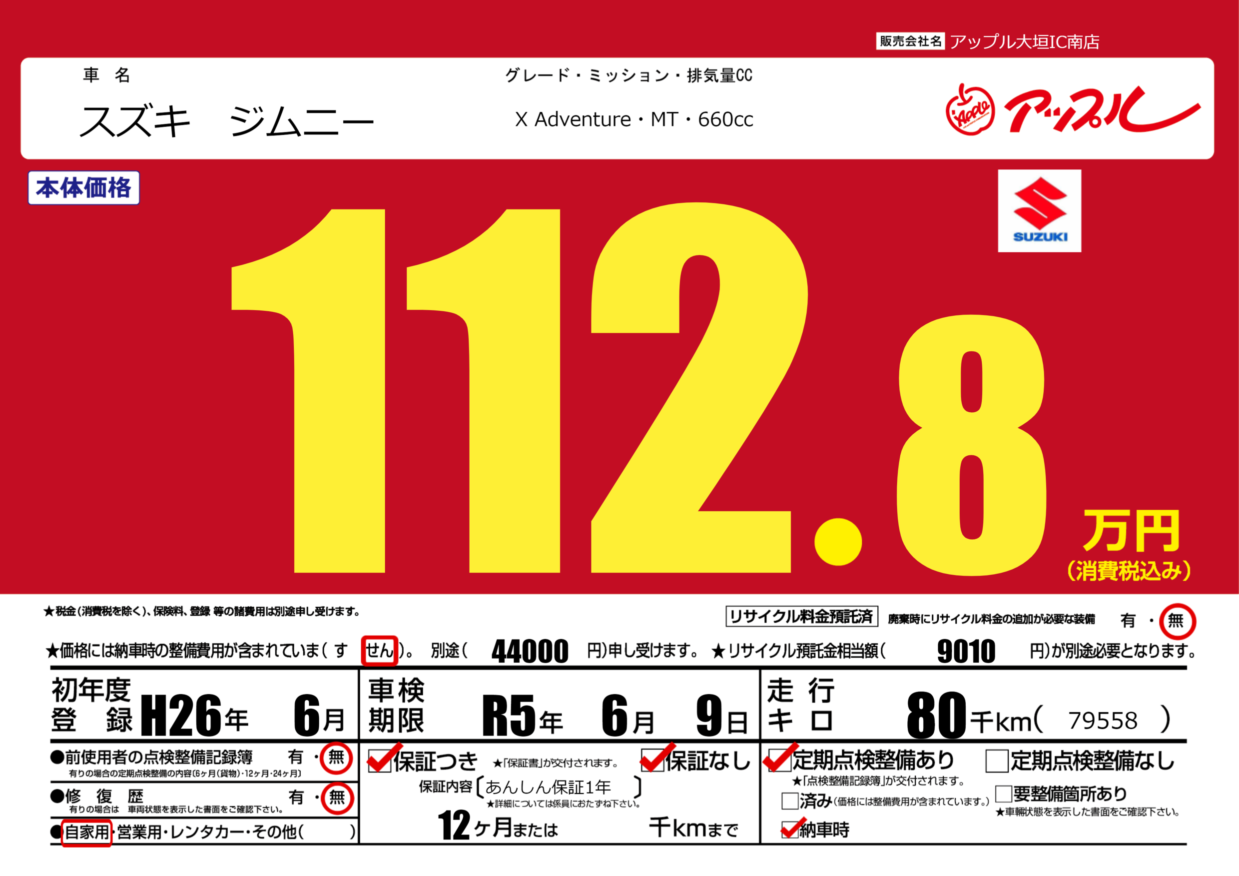 | 車名 | スズキ ジムニー | グレード ミッション 排気量 |