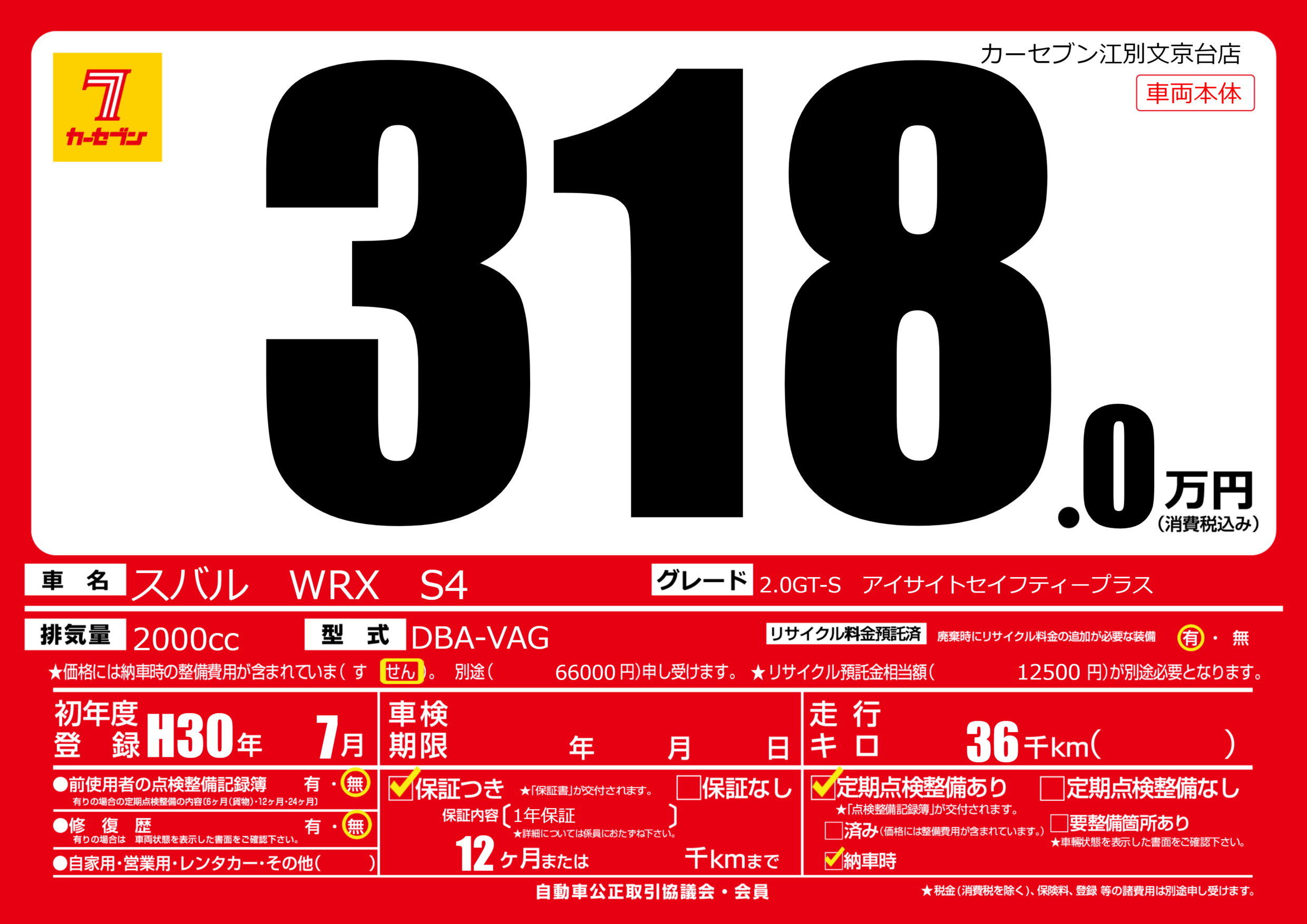 | 車名 | スバル WRX S4 | グレード ミッション 排気量 |