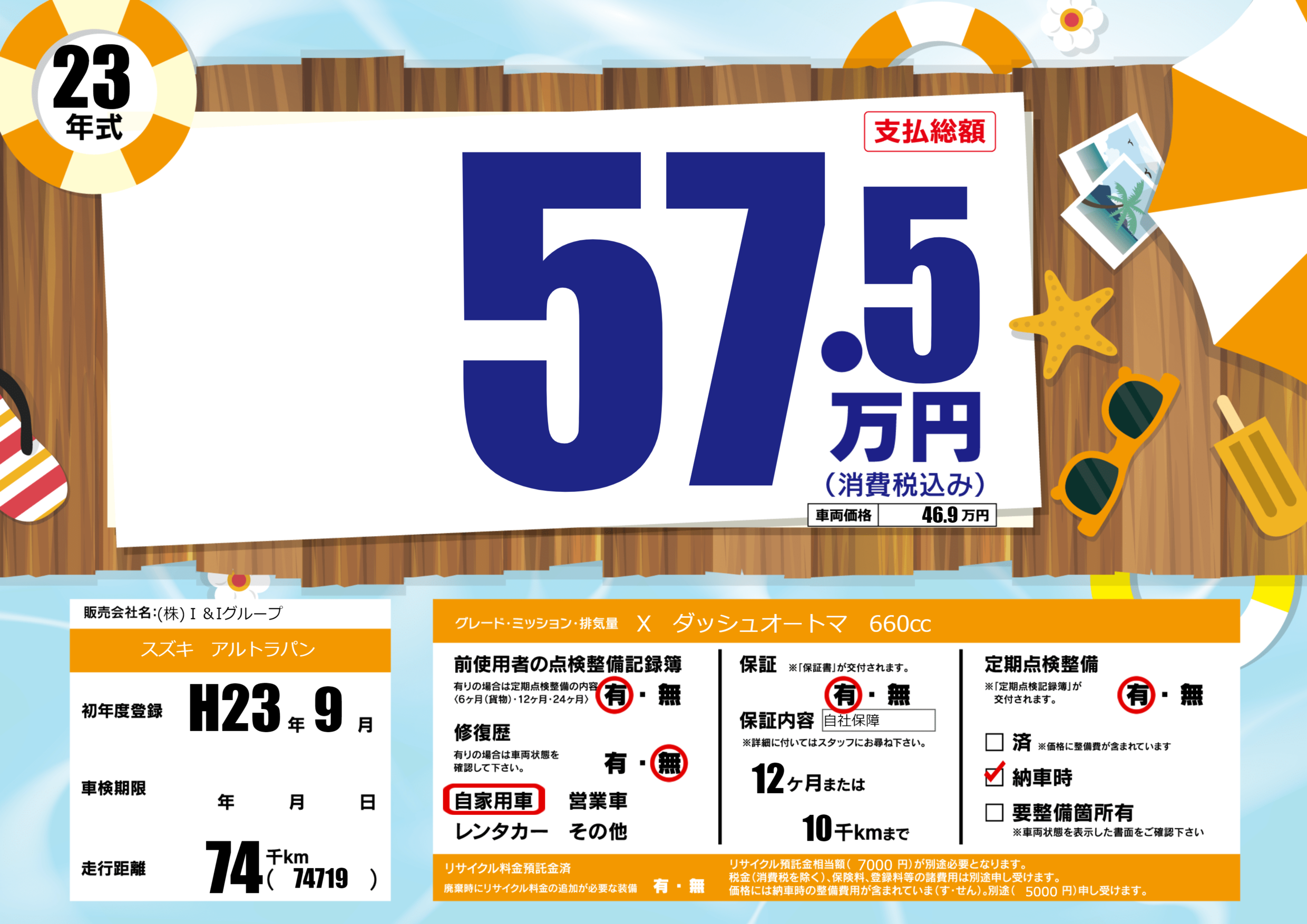 | 走行キロ | 7.4万km | 初年度登録 | H23年9月 |
