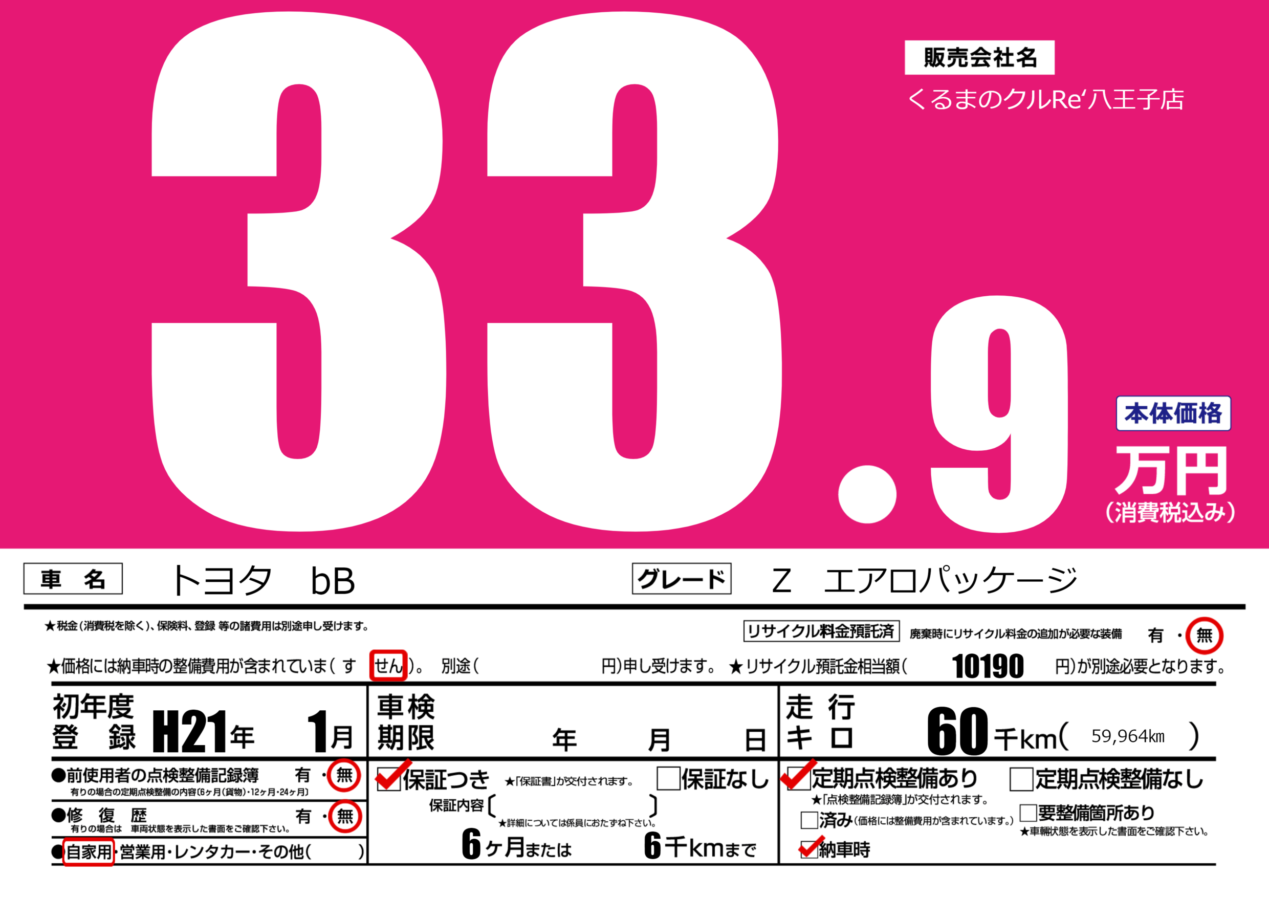 | 車名 | トヨタ bB | グレード ミッション 排気量 |