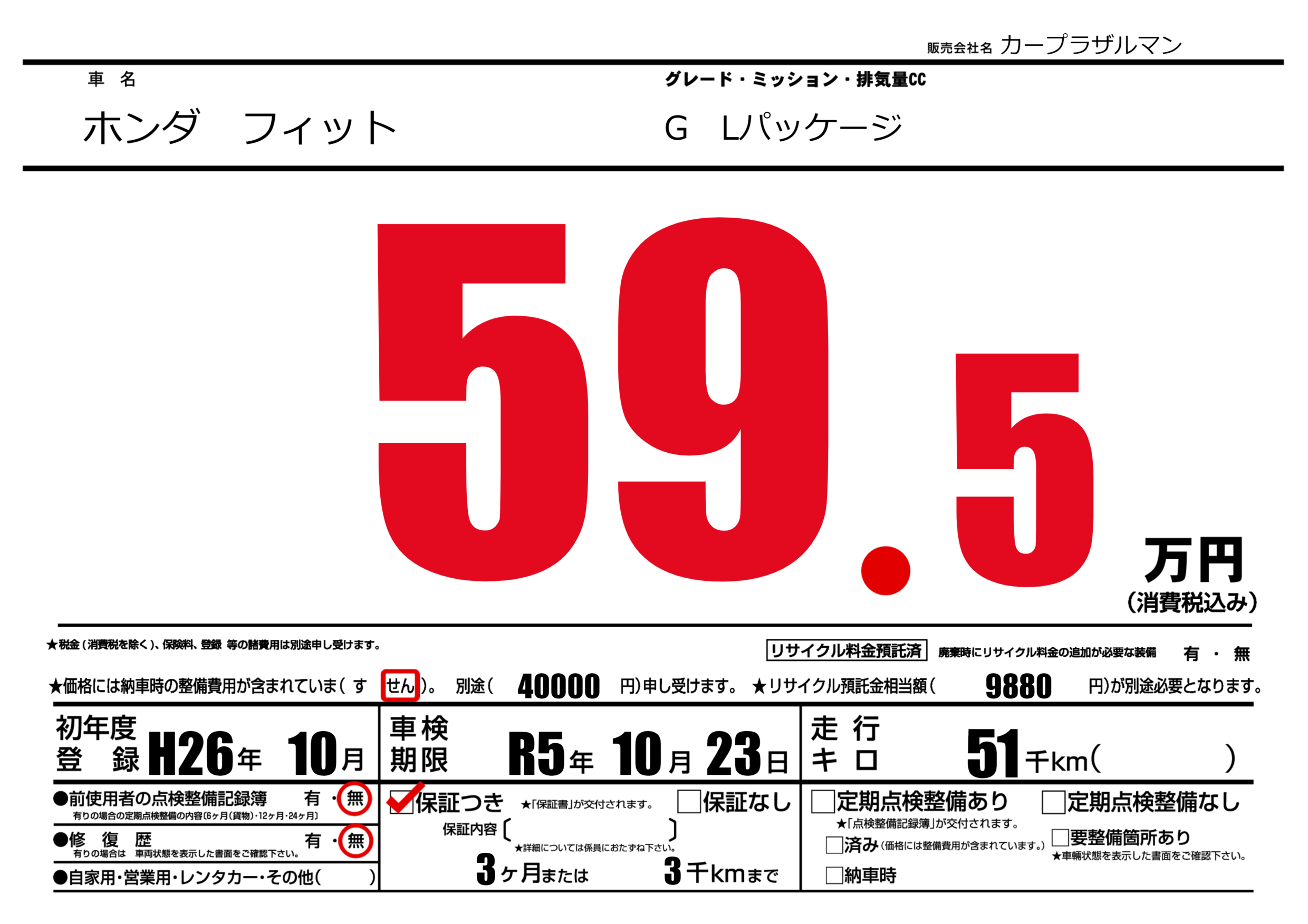 | 車名 | ホンダ フィット | グレード ミッション 排気量 |
