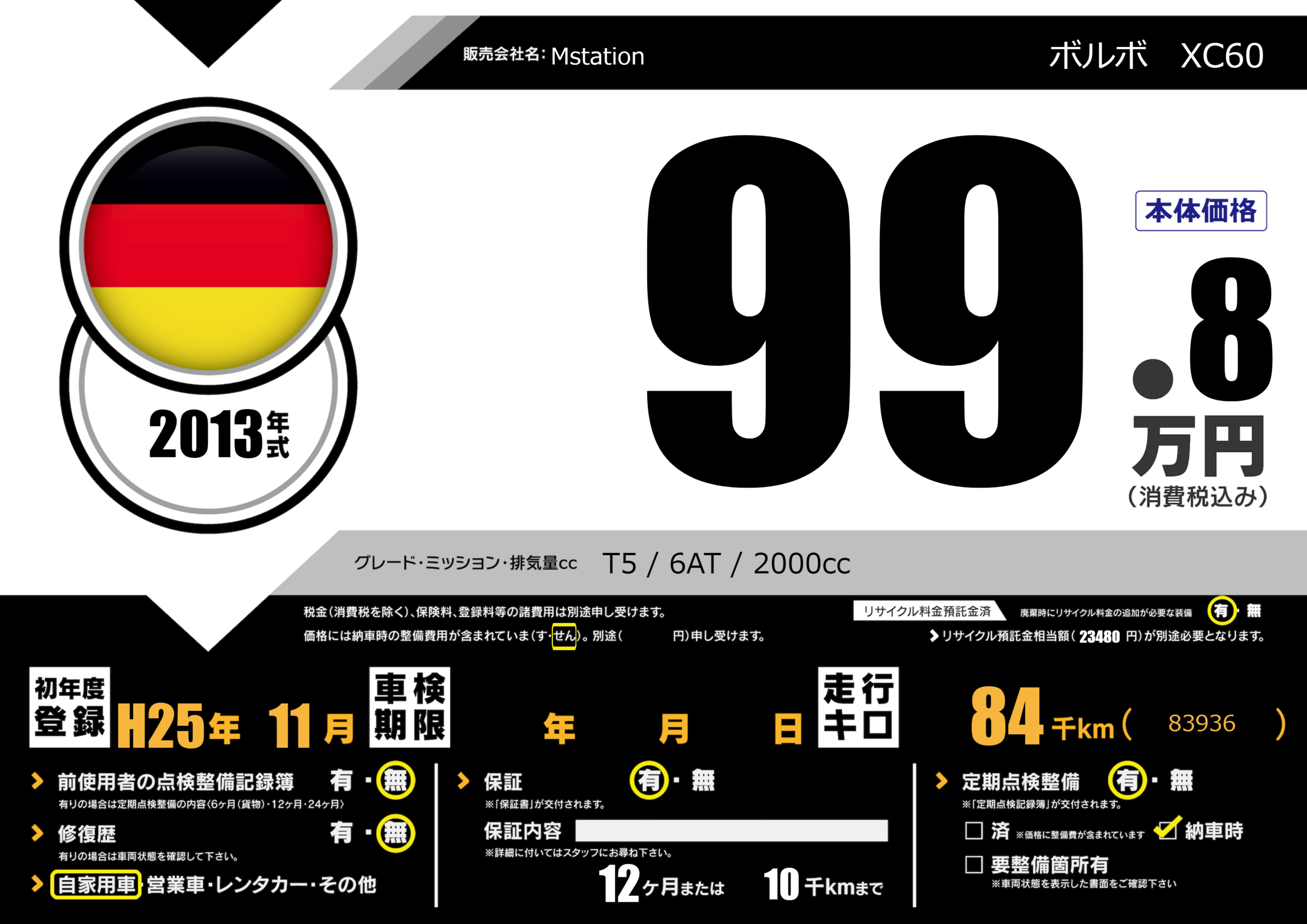 | 車名 | ボルボ XC60 | グレード ミッション 排気量 |