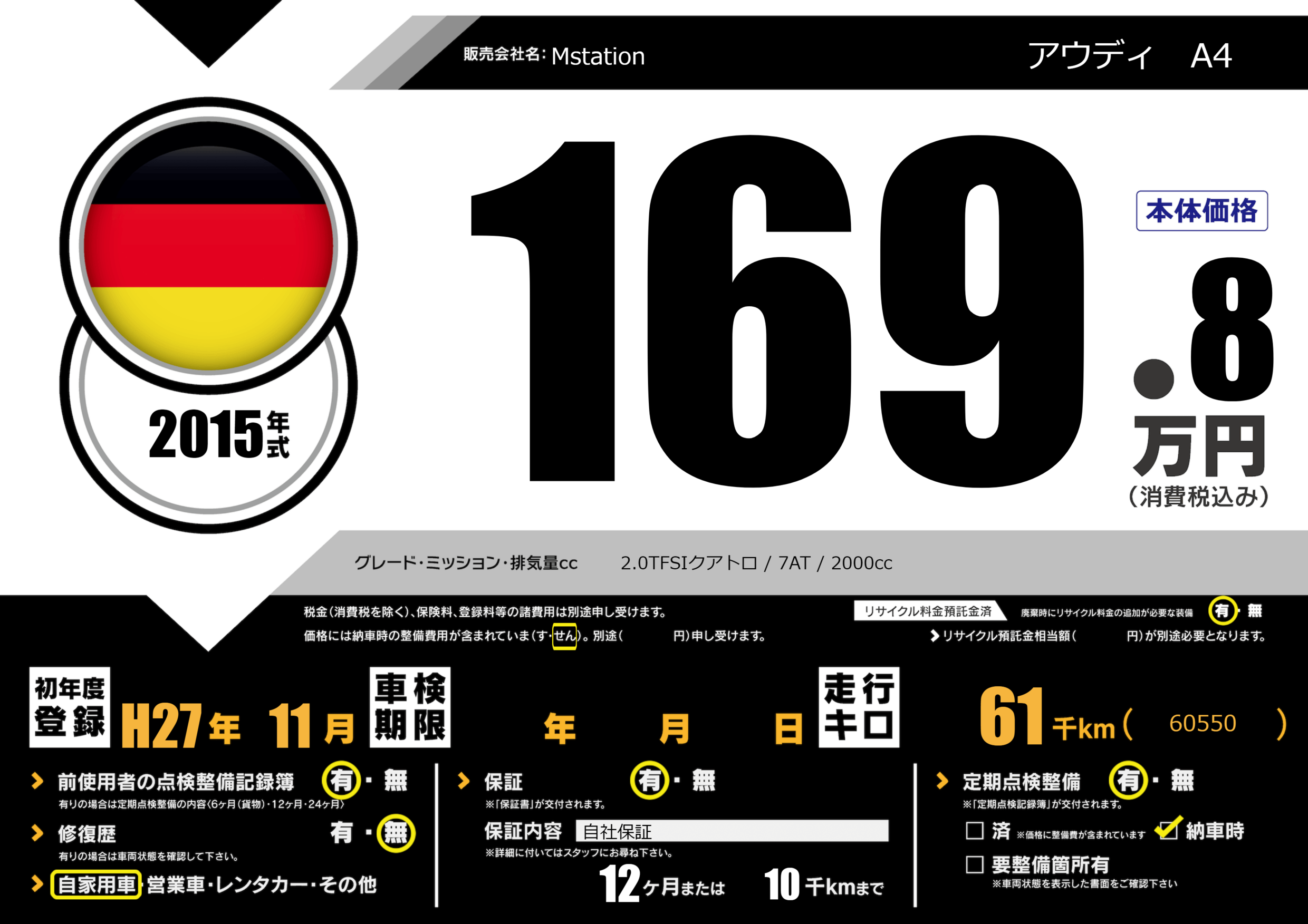 | 車名 | アウディ A4 | グレード ミッション 排気量 |