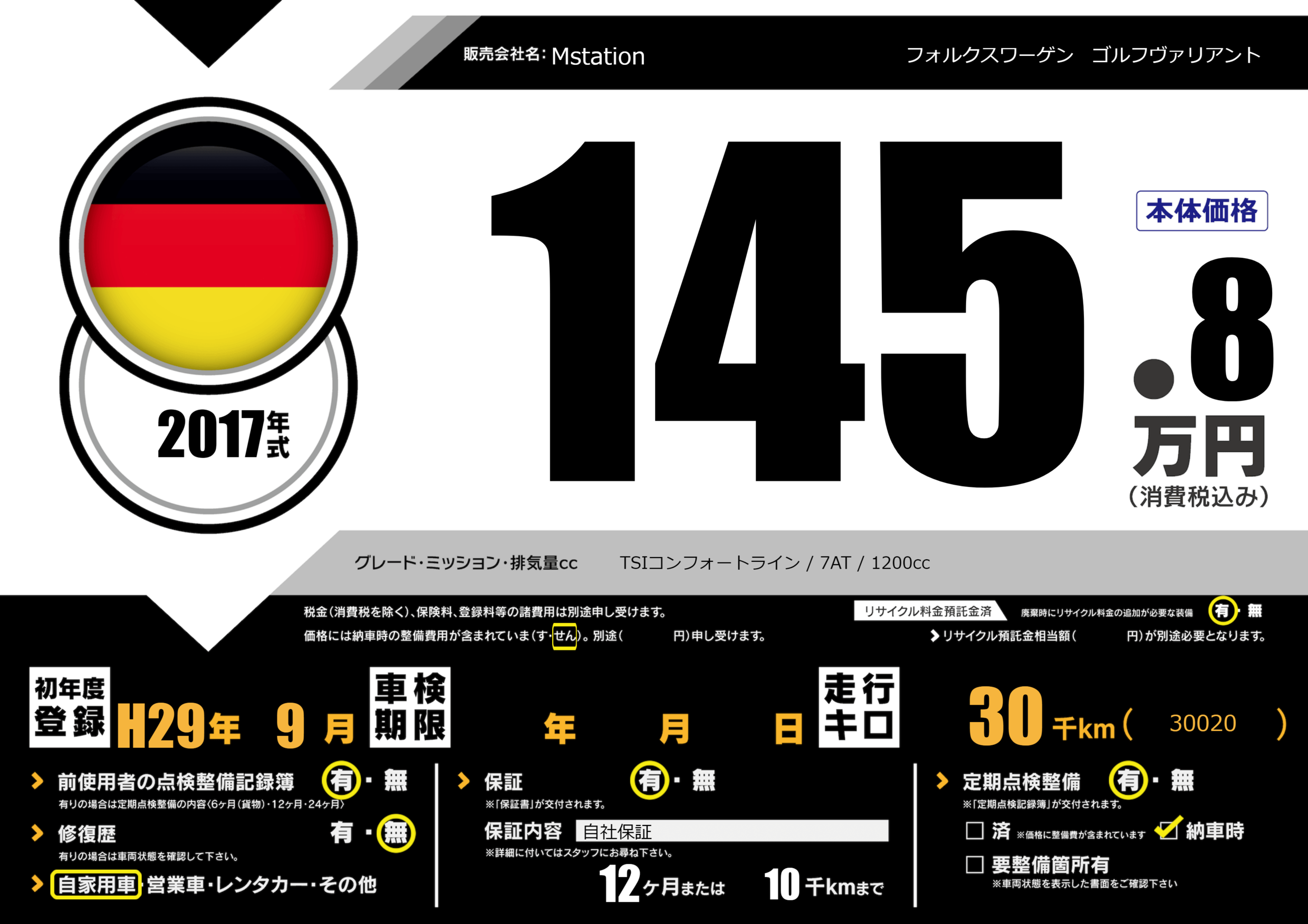 | 車名 | フォルクスワーゲン ゴルフヴァリアント | グレード ミッション 排気量 |