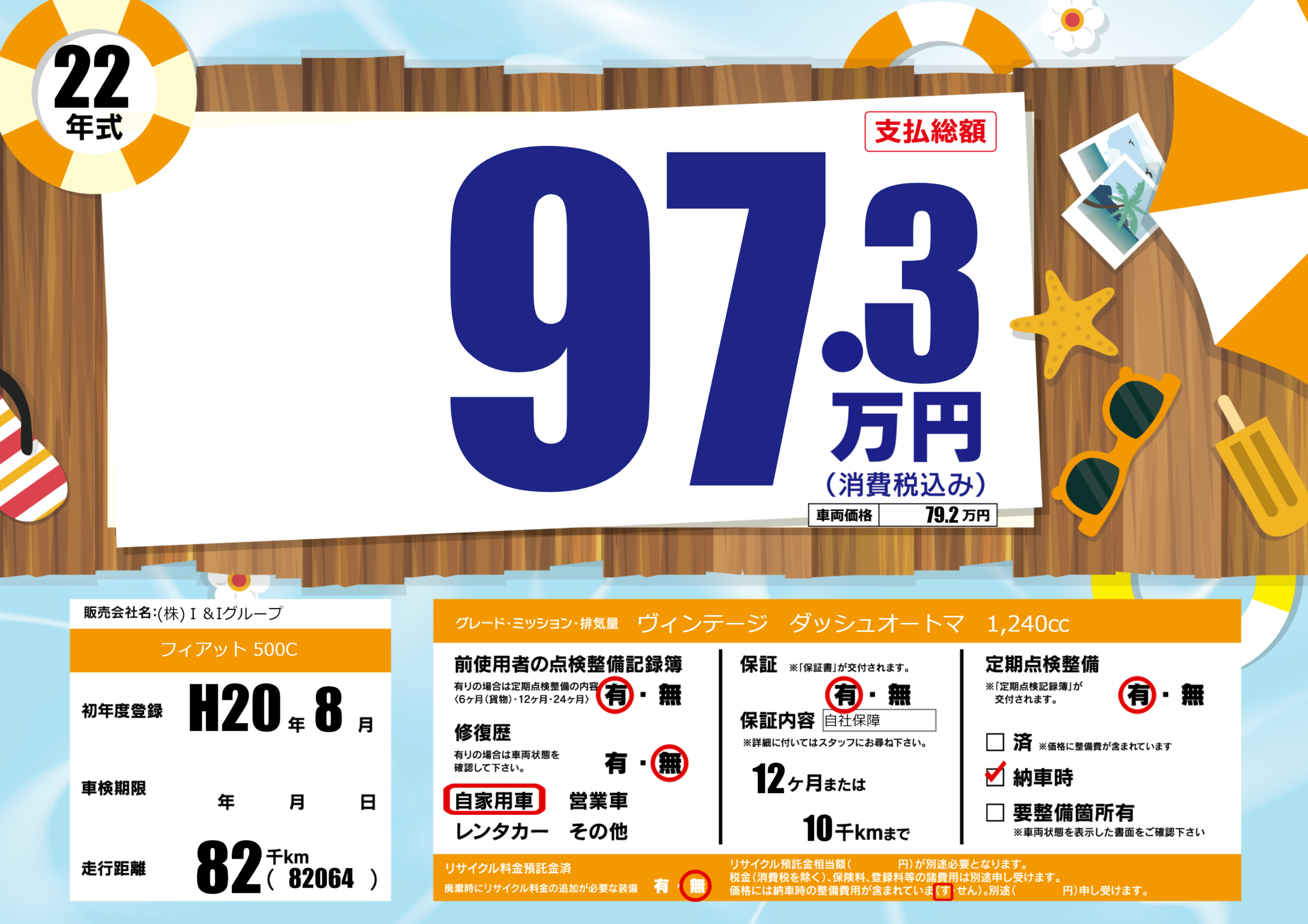 | 車名 | フィアット 500C | グレード ミッション 排気量 |