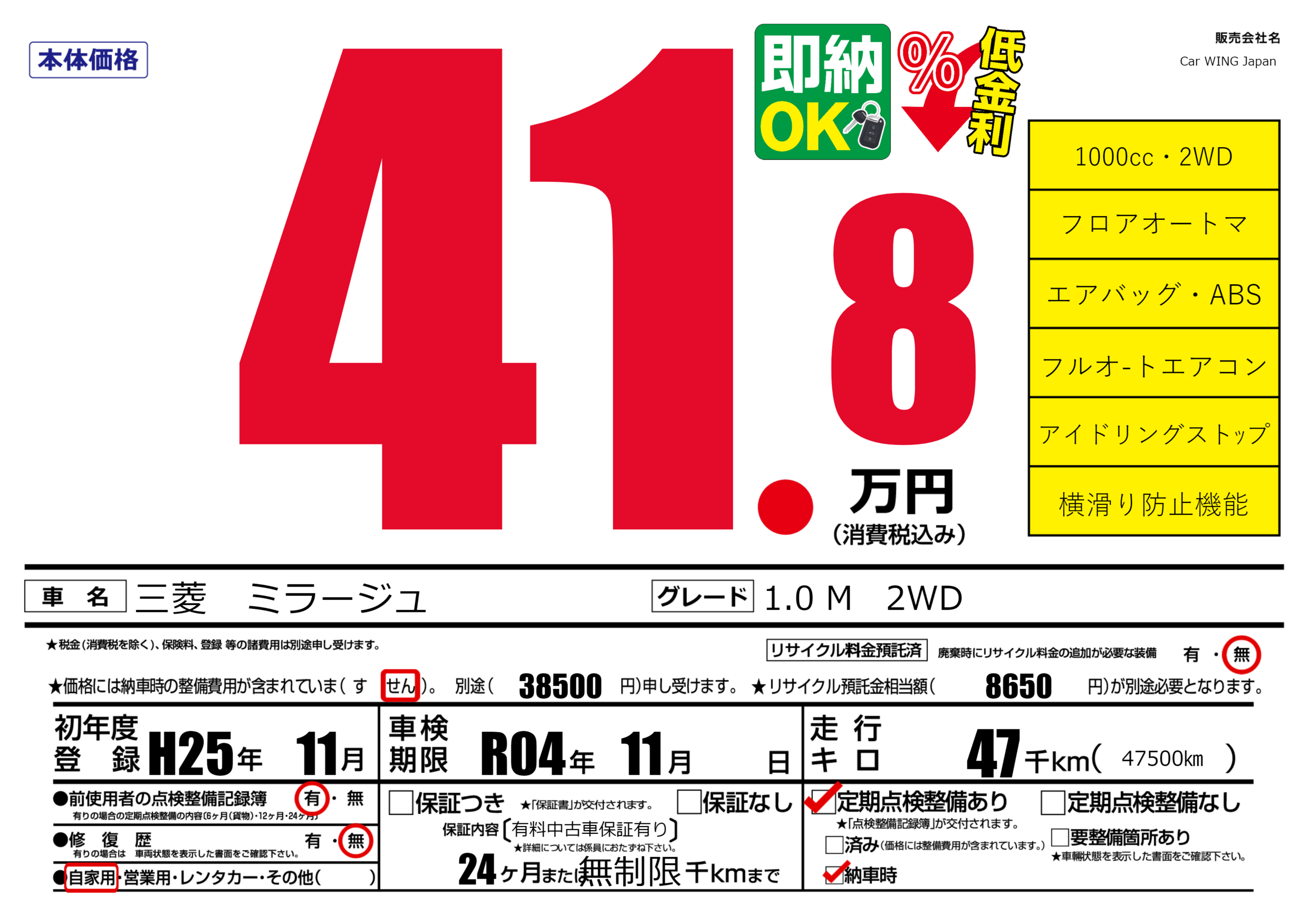 | 車名 | 三菱 ミラージュ | グレード ミッション 排気量 |
