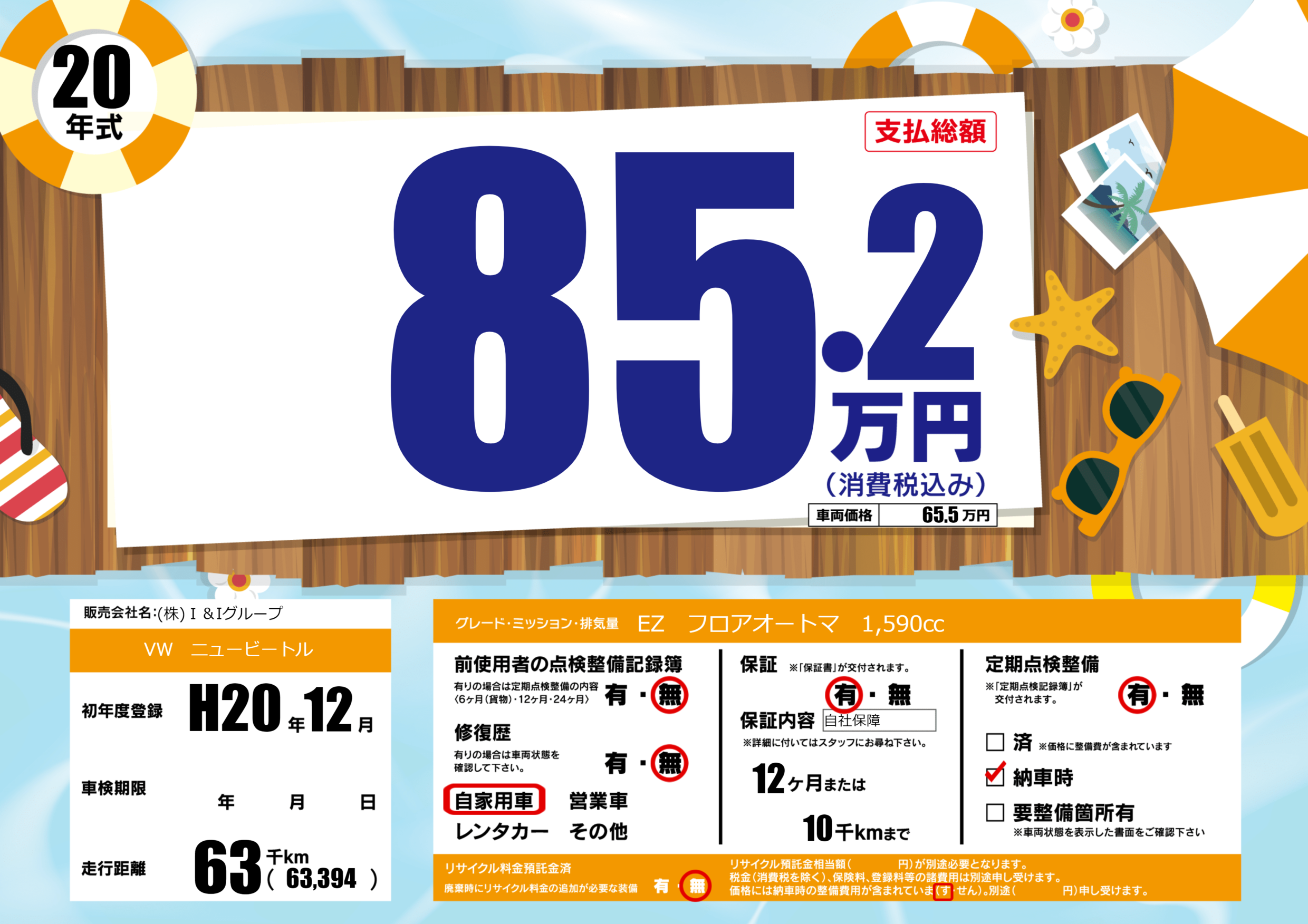 | 車名 | VW ニュービートル | グレード ミッション 排気量 |