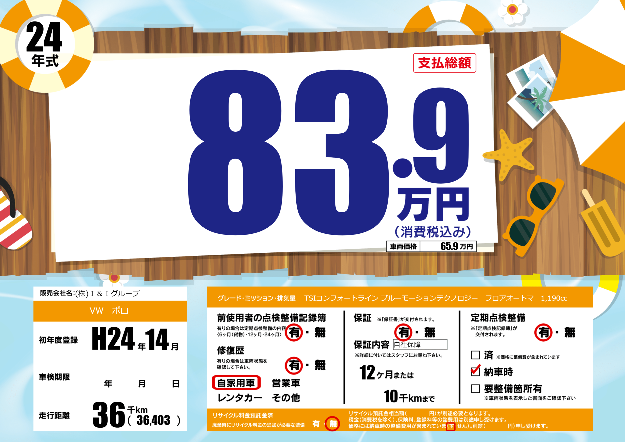 | 車名 | VW ポロ | グレード ミッション 排気量 |
