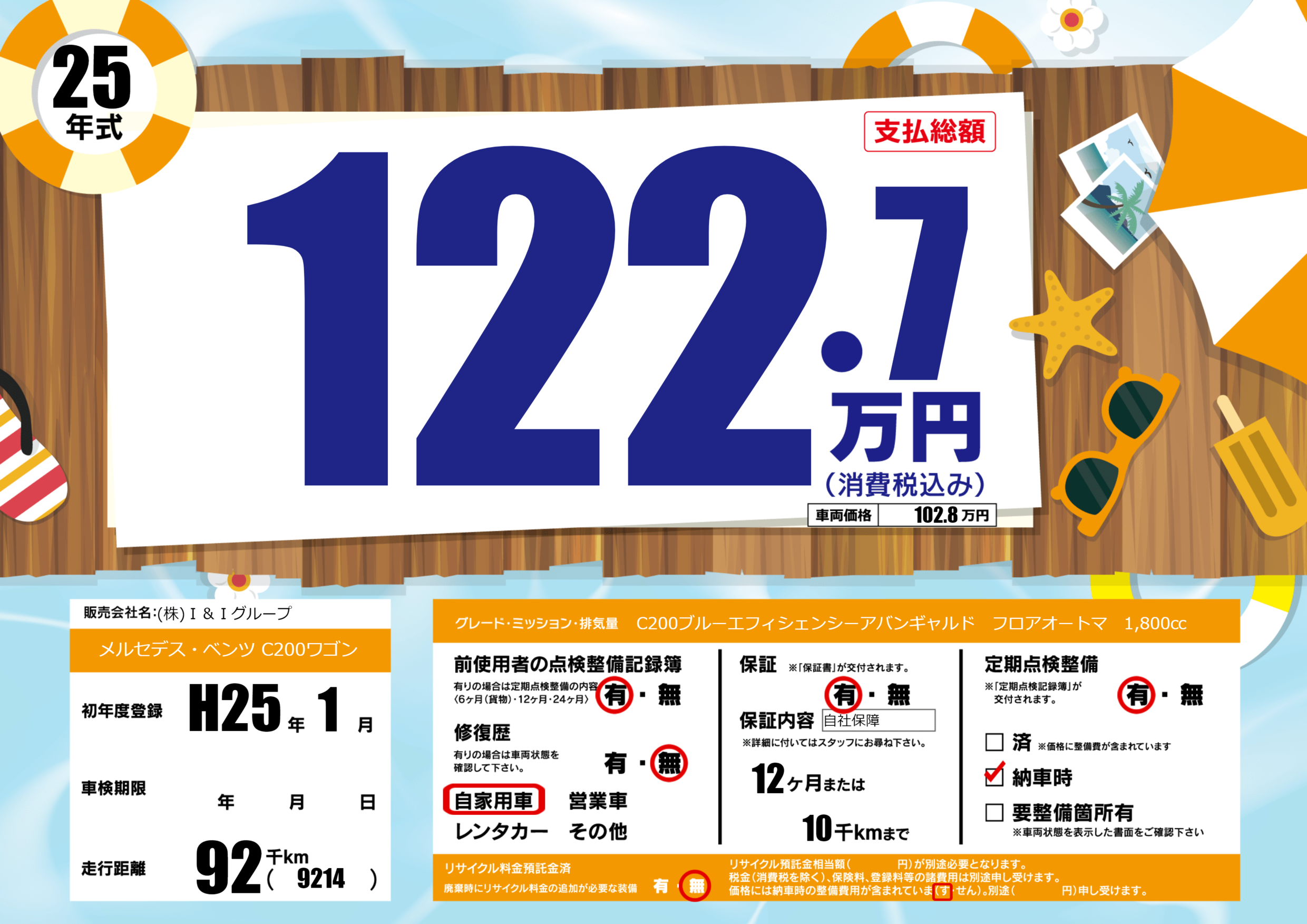 | 車名 | メルセデス・ベンツ C200ワゴン | グレード ミッション 排気量 |