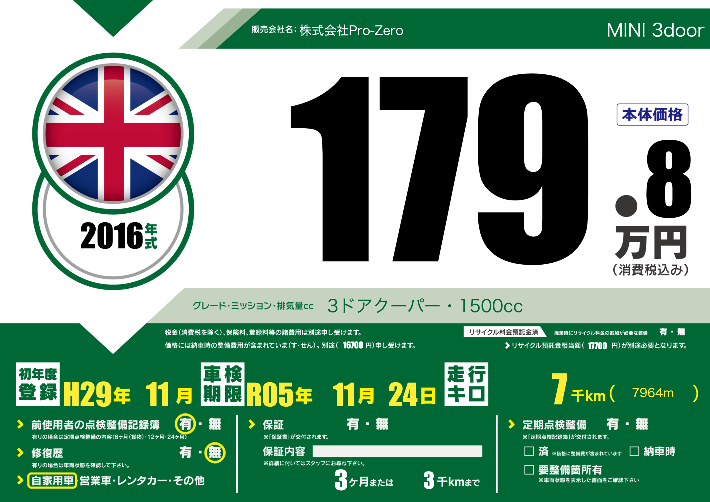 | 車名 | MINI 3door | グレード ミッション 排気量 |