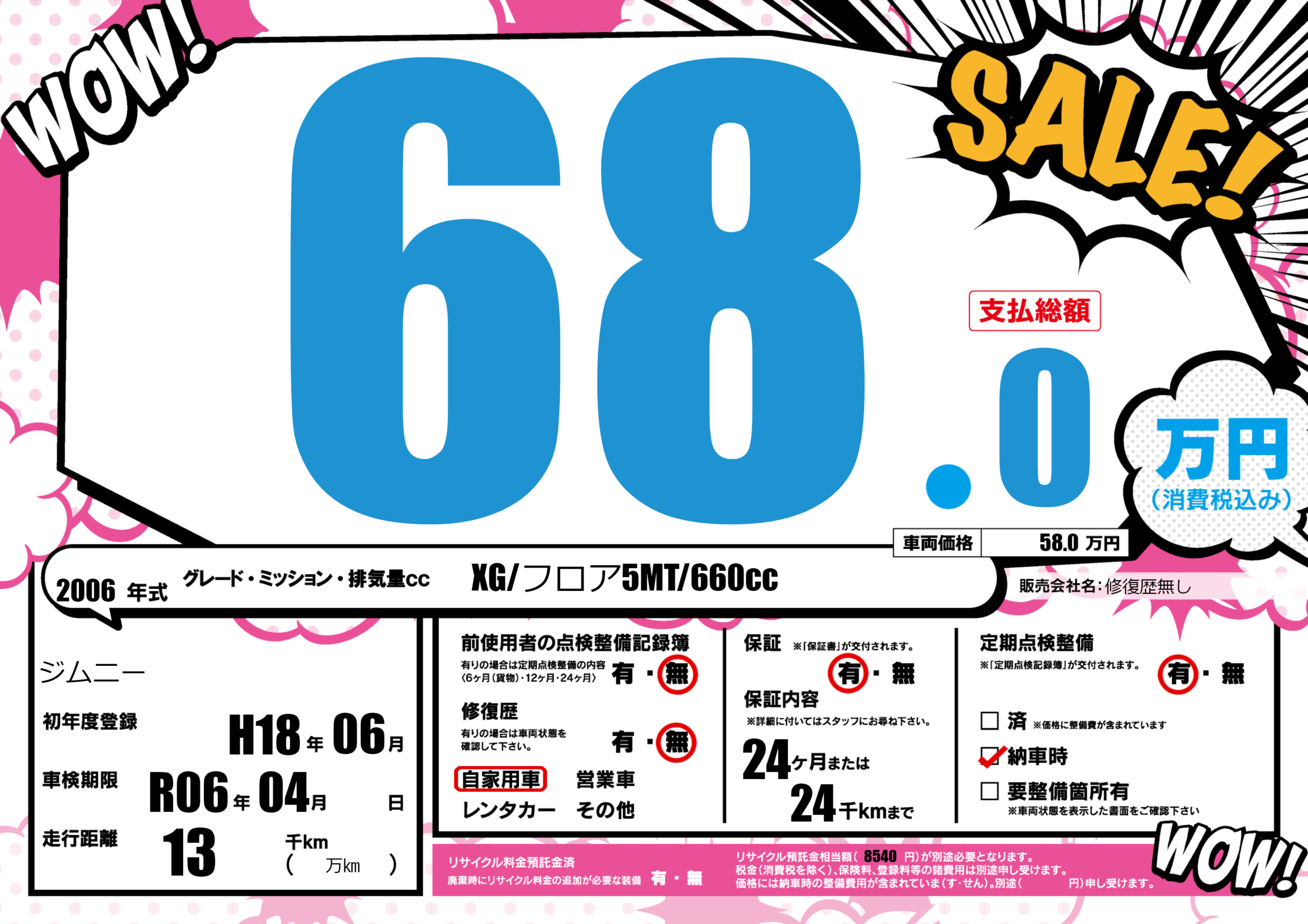 | 車名 | ジムニー | グレード ミッション 排気量 |